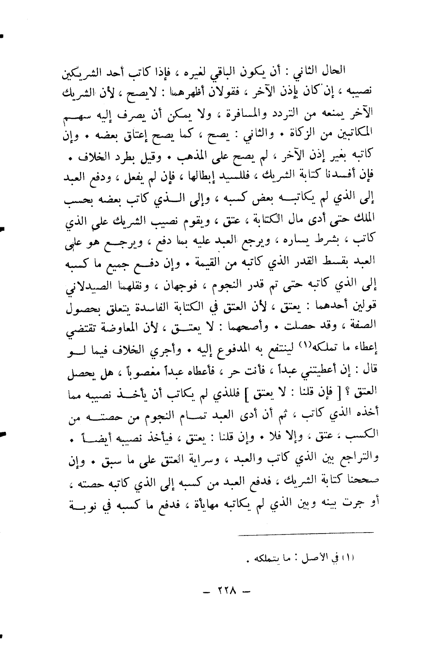 الْحَالُ الثَّانِي: أَنْ يَكُونَ الْبَاقِي لِغَيْرِهِ، فَإِذَا كَاتَبَ أَحَدُ الشَّرِيكَيْنِ نَصِيبَهُ، إِنْ كَانَ بِإِذْنِ الْآخَرِ، فَقَوْلَانِ أَظْهَرُهُمَا: لَا يَصِحُّ؛ لِأَنَّ الشَّرِيكَ الْآخَرَ يَمْنَعُهُ مِنَ التَّرَدُّدِ وَالْمُسَافَرَةِ، وَلَا يُمْكِنُ أَنْ يُصْرَفَ إِلَيْهِ سَهْمُ الْمُكَاتَبِينَ مِنَ الزَّكَاةِ.