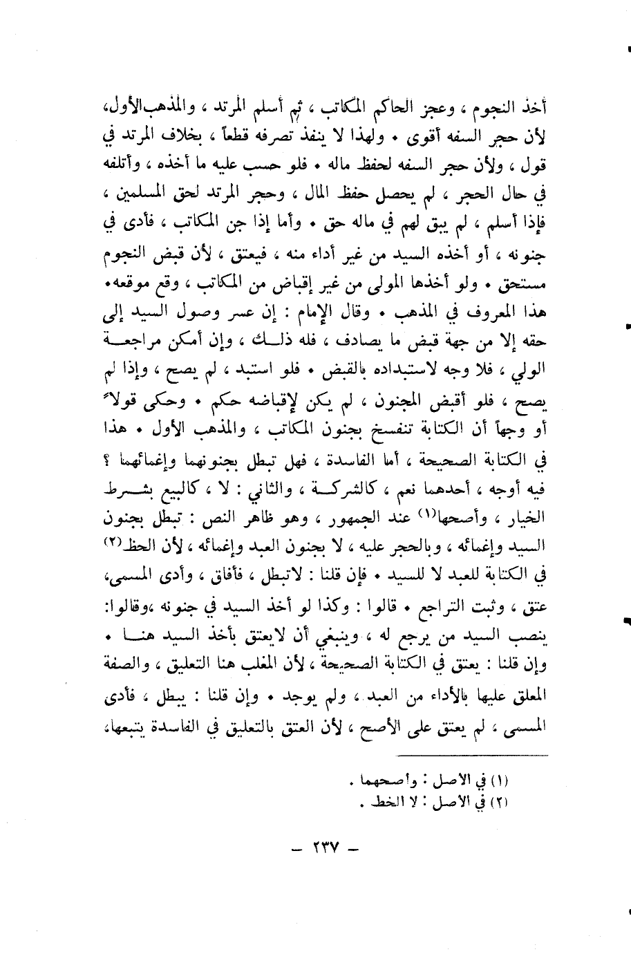 أَخَذَ النُّجُومَ، وَعَجَّزَ الْحَاكِمُ الْمُكَاتَبَ، ثُمَّ أَسْلَمَ الْمُرْتَدُّ، وَالْمَذْهَبُ الْأَوَّلُ؛ لِأَنَّ حَجْرَ السَّفَهِ أَقْوَى، وَلِهَذَا لَا يَنْفُذُ تَصَرُّفُهُ قَطْعًا، بِخِلَافِ الْمُرْتَدِّ فِي قَوْلٍ، وَلِأَنَّ حَجْرَ السَّفَهِ لِحِفْظِ مَالِهِ. فَلَوْ حُسِبَ عَلَيْهِ مَا أَخَذَهُ، وَأَتْلَفَهُ فِي حَالِ الْحَجْرِ لَمْ يَحْصُلْ حِفْظُ الْمَالِ، وَحَجْرُ الْمُرْتَدِّ لِحَقِّ الْمُسْلِمِينَ، فَإِذَا أَسْلَمَ، لَمْ يَبْقَ لَهُمْ فِي مَالِهِ حَقٌّ.