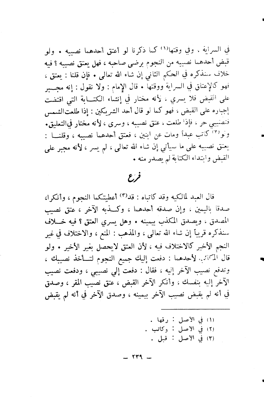 فِي السِّرَايَةِ، وَفِي وَقْتِهَا كَمَا ذَكَرْنَا لَوْ أَعْتَقَ أَحَدُهُمَا نَصِيبَهُ. وَلَوْ قَبَضَ أَحَدُهُمَا نَصِيبَهُ مِنَ النُّجُومِ بِرِضَى صَاحِبِهِ، فَهَلْ يُعْتَقُ نَصِيبُهُ؟ فِيهِ خِلَافٌ سَنَذْكُرُهُ فِي الْحُكْمِ الثَّانِي إِنْ شَاءَ اللَّهُ تَعَالَى.