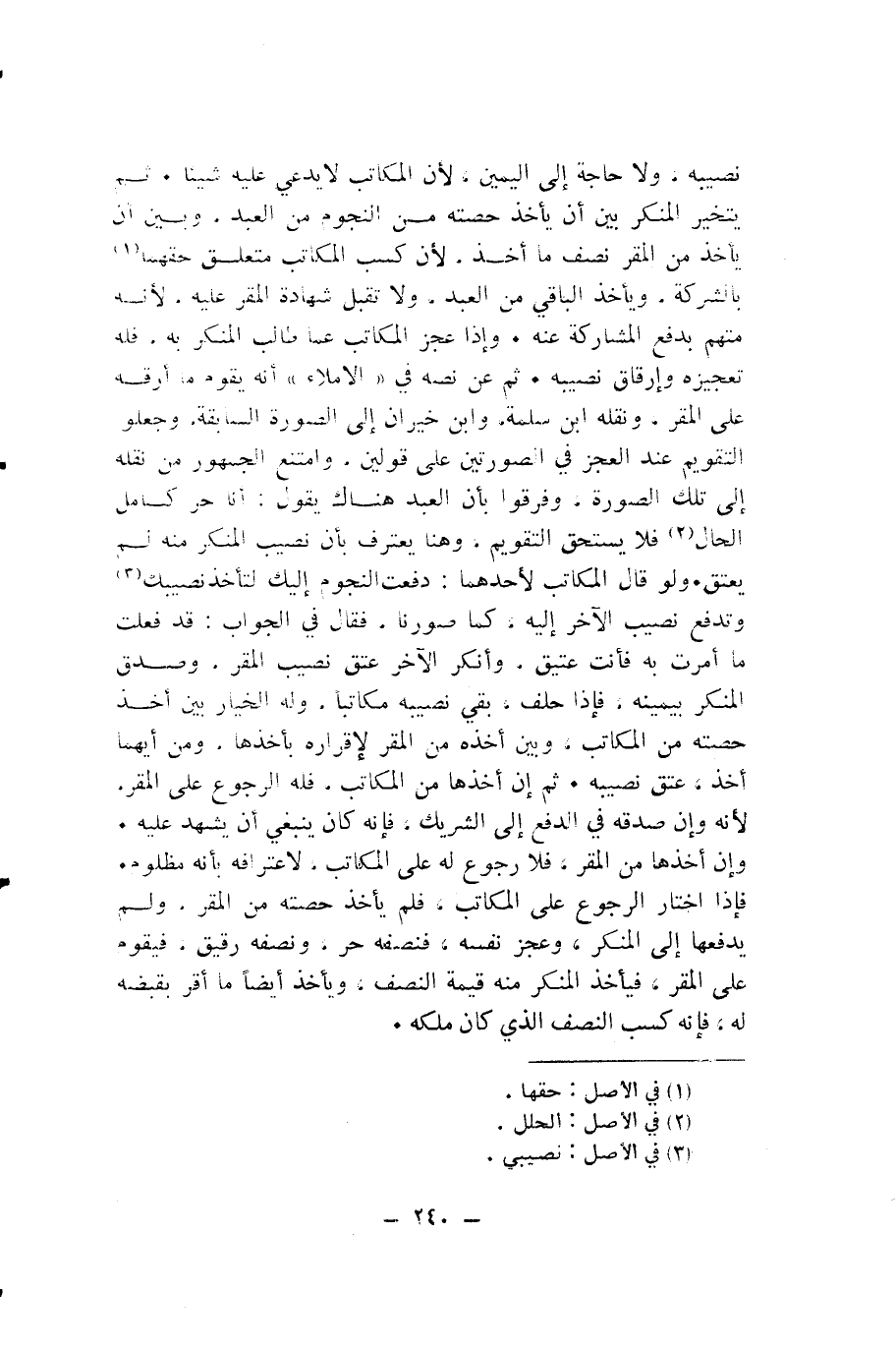 ثُمَّ يُتَخَيَّرُ الْمُنْكِرُ بَيْنَ أَنْ يَأْخُذَ حِصَّتَهُ مِنَ النُّجُومِ مِنَ الْعَبْدِ، وَبَيْنَ أَنْ يَأْخُذَ مِنَ الْمُقِرِّ نِصْفَ مَا أَخَذَ؛ لِأَنَّ كَسْبَ الْمُكَاتَبِ مُتَعَلَّقُ حَقِّهِمَا بِالشَّرِكَةِ، وَيَأْخُذُ الْبَاقِي مِنَ الْعَبْدِ، وَلَا تُقْبَلُ شَهَادَةُ الْمُقَرِّ عَلَيْهِ؛ لِأَنَّهُ مُتَّهَمٌ بِدَفْعِ الْمُشَارَكَةِ عَنْهُ.