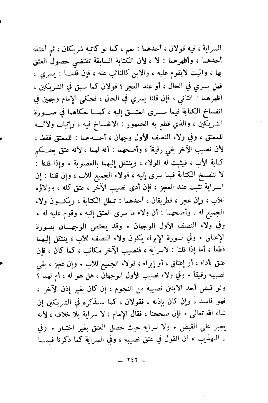 أَظْهَرُهُمَا: الثَّانِي فَإِنْ قُلْنَا يَسْرِي فِي الْحَالِ، فَحَكَى الْإِمَامُ وَجْهَيْنِ فِي انْفِسَاخِ الْكِتَابَةِ فِيمَا سَرَى الْعِتْقُ إِلَيْهِ، كَمَا حَكَاهُمَا فِي صُورَةِ الشَّرِيكَيْنِ، وَالَّذِي قَطَعَ بِهِ الْجُمْهُورُ: الِانْفِسَاخُ فِيهِ، وَإِثْبَاتُ وَلَائِهِ لِلْمُعْتِقِ، وَفِي وَلَاءِ النِّصْفِ الْأَوَّلِ وَجْهَانِ.