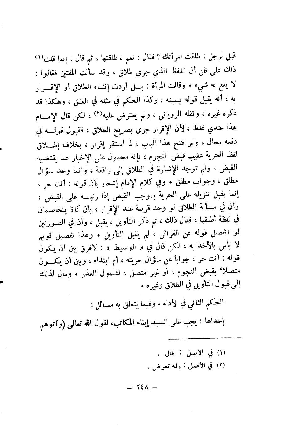 قِيلَ لِرَجُلٍ: طَلَّقْتَ امْرَأَتَكَ؟ فَقَالَ: نَعَمْ، طَلَّقْتُهَا، ثُمَّ قَالَ: إِنَّمَا قُلْتُ ذَلِكَ عَلَى ظَنِّ أَنَّ اللَّفْظَ الَّذِي جَرَى طَلَاقٌ، وَقَدْ سَأَلْتُ الْمُفْتِينَ فَقَالُوا: لَا يَقَعُ بِهِ شَيْءٌ. وَقَالَتِ الْمَرْأَةُ: بَلْ أَرَدْتَ إِنْشَاءَ الطَّلَاقِ أَوِ الْإِقْرَارَ بِهِ، أَنَّهُ يُقْبَلُ قَوْلُهُ بِيَمِينِهِ، وَكَذَا الْحُكْمُ فِي مِثْلِهِ فِي الْعِتْقِ، وَهَكَذَا قَدْ ذَكَرَهُ غَيْرُهُ، وَنَقَلَهُ الرُّويَانِيُّ، وَلَمْ يَعْتَرِضْ عَلَيْهِ، لَكِنْ قَالَ الْإِمَامُ هَذَا عِنْدِي غَلَطٌ؛ لِأَنَّ الْإِقْرَارَ جَرَى بِصَرِيحِ الطَّلَاقِ، فَقَبُولُ قَوْلِهِ فِي دَفْعِهِ مُحَالٌ.