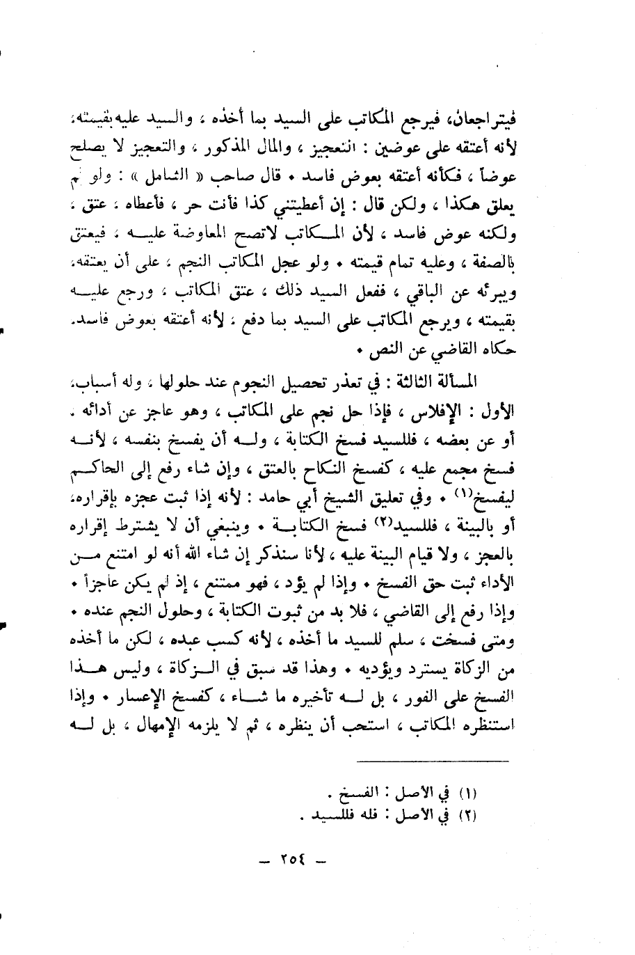 الْمَسْأَلَةُ الثَّالِثَةُ: فِي تَعَذُّرِ تَحْصِيلِ النُّجُومِ عِنْدَ حُلُولِهَا، وَلَهُ أَسْبَابٌ الْأَوَّلُ: الْإِفْلَاسُ، فَإِذَا حَلَّ نَجْمٌ عَلَى الْمُكَاتَبِ، وَهُوَ عَاجِزٌ عَنْ أَدَائِهِ، أَوْ عَنْ بَعْضِهِ، فَلِلسَّيِّدِ فَسْخُ الْكِتَابَةِ، وَلَهُ أَنْ يَفْسَخَ بِنَفْسِهِ؛ لِأَنَّهُ فَسْخٌ مُجْمَعٌ عَلَيْهِ كَفَسْخِ النِّكَاحِ بِالْعِتْقِ، وَإِنْ شَاءَ رَفَعَ إِلَى الْحَاكِمِ لِيَفْسَخَ.