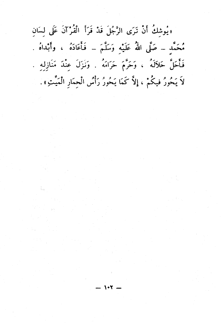 "يُوْشِكُ أَنْ تَرَى الرَّجُلَ قَدْ قَرَأَ الْقُرْآنِ عَلَى لِسَانِ مُحَمَّدٍ ـ صلّى الله عليه وسلّم ـ فَأَعَادَهُ، وَأَبْدَاهُ. فَأَحَلَّ حَلاَلَهَ، وَحَرَّمَ حَرَامَهُ. وَنَزَلَ عِنْدَ مَنَازِلِهِ. لاَ يَحُورُ فِيكُم، إِلاَّ كَمَا يَحُورُ رَأْسُ الْحِمَارِ الْمَيِّتِ".