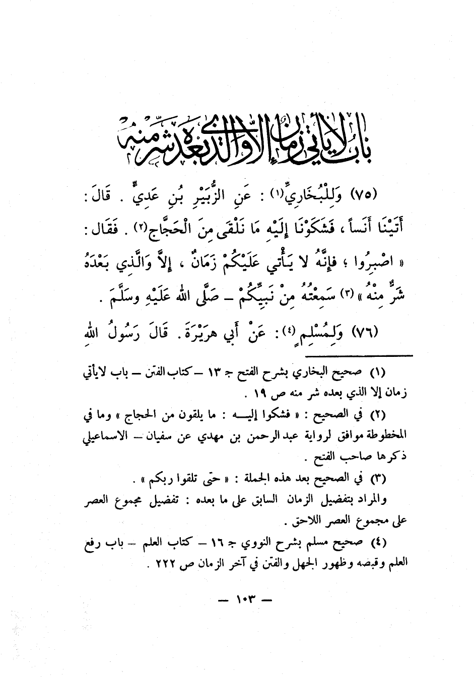 (75) وللبخاريّ1: عن الزّبير بن عديّ. قال: أتينا أنساً، فَشَكَوْنَا إليه ما نلقى من الحجاج2. فقال: "اصْبِرُوا؛ فَإِنَّهُ لا يَأْتِي عَلَيْكُم زَمَانٌ إَلاّ والّذي بَعْدَهُ شَرٌّ مِنْهُ"3، سَمِعْتُهِ من نبيِّكم – صلّى الله عليه وسلّم -.