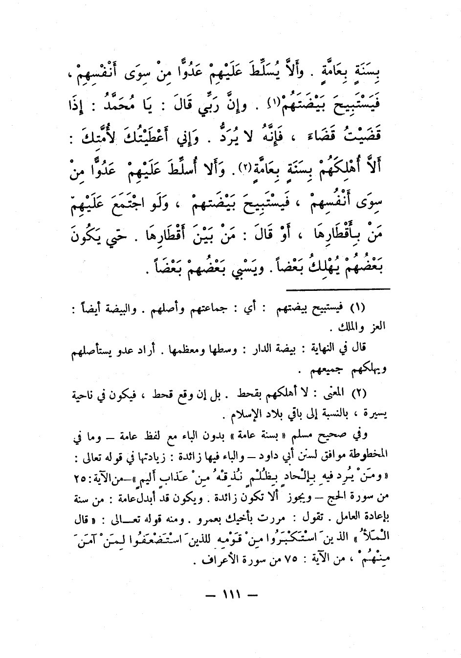 بِسَنَةٍ بِعَامَّةٍ، وألاّ يُسَلِّطَ عَلَيْهُم عَدُواً مِن سَوى أَنْفِسِهُم، فَيَسْتَبِيْحَ بَيْضَتَهُم1، وَإنَّ رَبِّي قال: يا محمّد! إذا قَضَيْتُ قَضَاءً، فَإِنَّهُ لاَ يُرَدُّ، وَإِنِّي أَعْطَيْتُكَ لأُمَّتِكَ: أَلاّ أُهْلِكَهُم بِسَنَةٍ بِعَامَّةٍ2. وألاّ أُسَلِّطَ عَلَيْهُم عَدُواً مِن سِوى أَنْفِسِهًم، فَيَسْتَبِيحَ بَيْضَتَهُم، وَلَوِ اجْتَمَعَ عَلَيْهُم مَنْ بِأَقْطَارِهَا، أو قال: مَنْ بَيْنَ أَقْطَارِهَا حَتَّى يَكُونَ بَعْضُهُم يُهْلِكُ بَعْضاً، وَيَسْبِي بَعْضُهُم بَعْضاً.