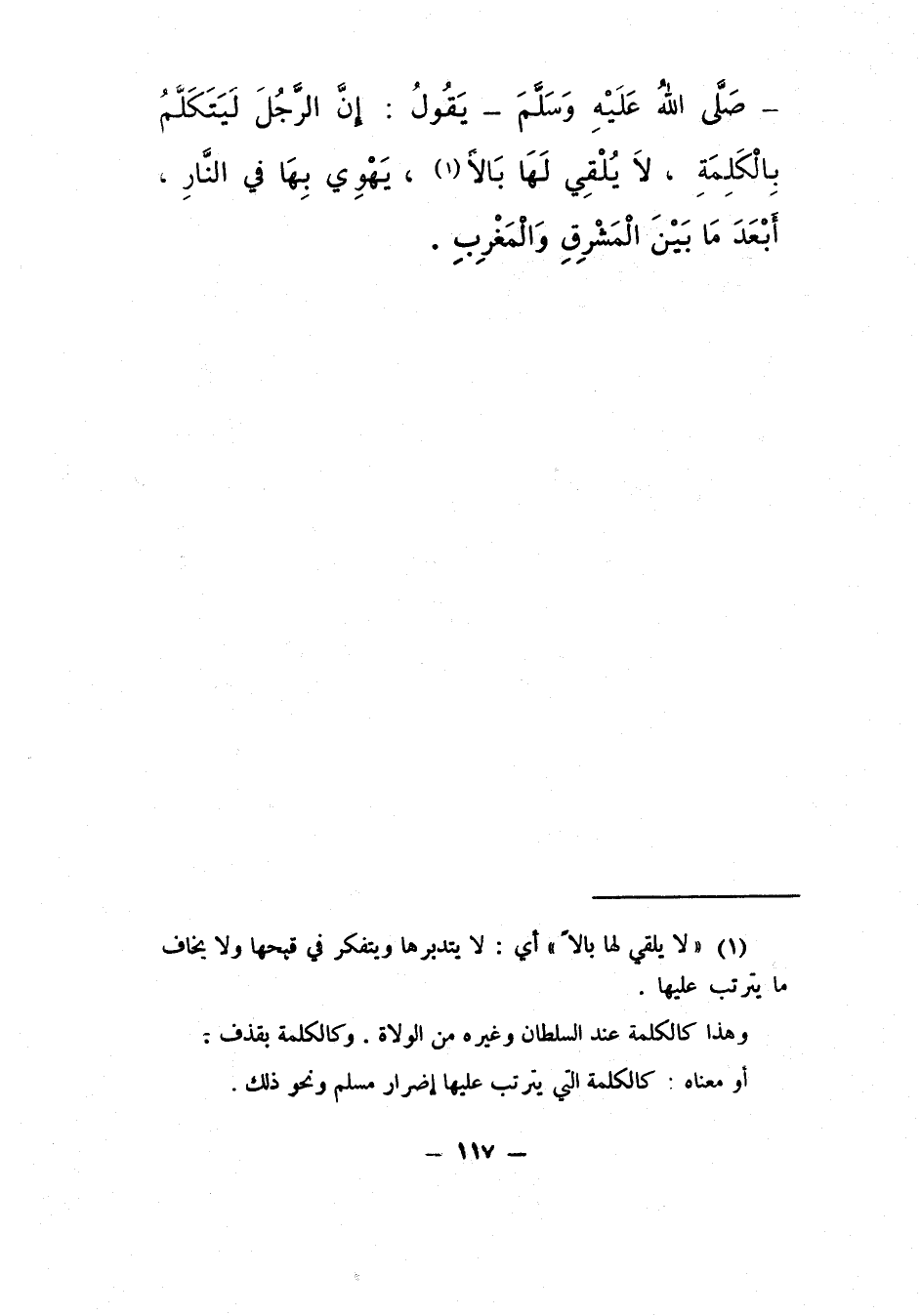 "إنّ الرّجلَ لَيَتَكَلَّمُ بِالْكِلْمَةِ، لا يُلْقِي لَها بالاً1، يَهْوي بَها فِي النّار، أَبْعَدَ مَا بَيْنَ الْمَشْرِقِ والْمَغْرِبِ.