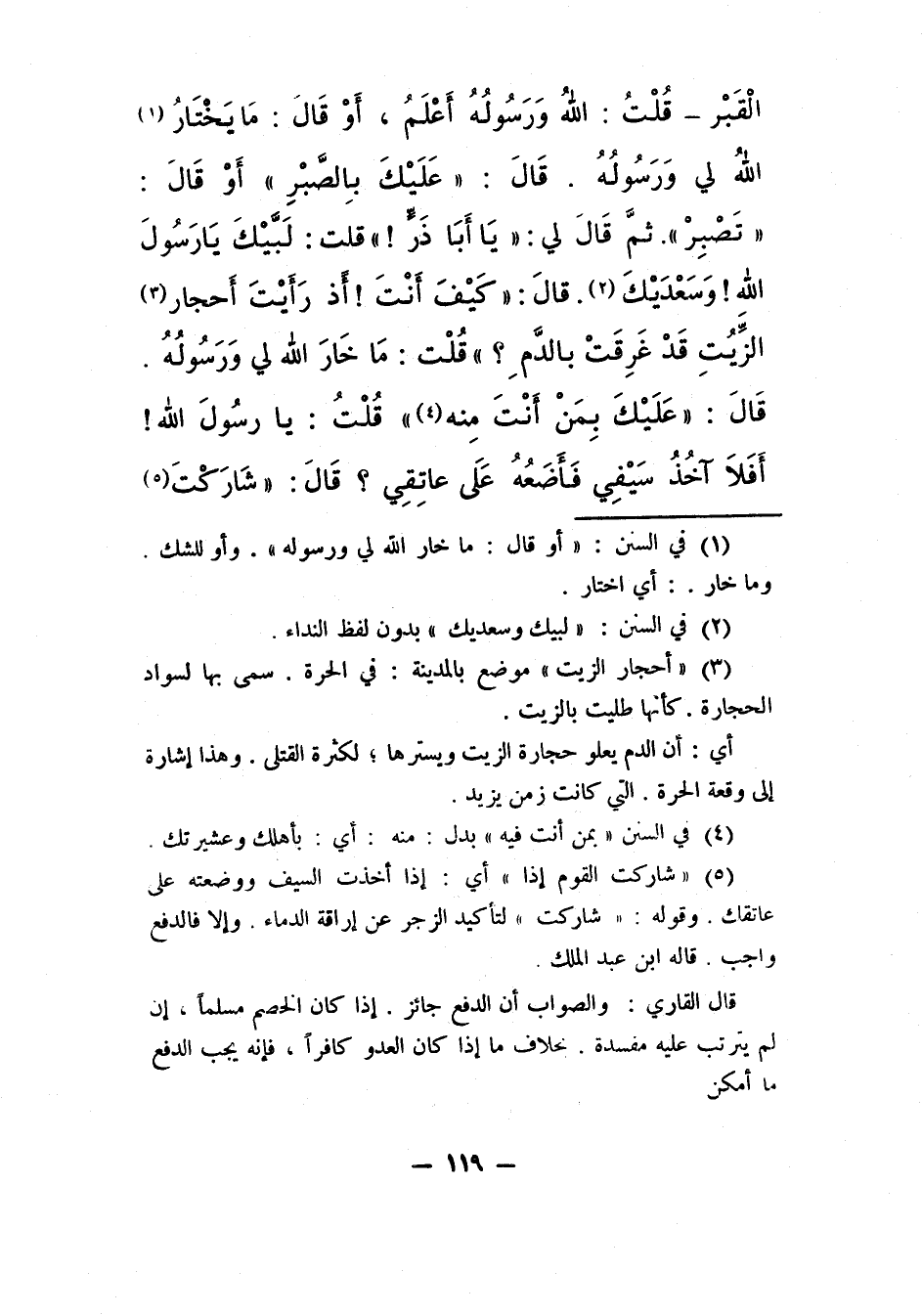 الْقَبْر – قلت: الله ورسولُهُ أَعْلَمُ، أو قال: ما يَخْتَارُ1 الله لي ورسولُهُ. قال: "عَلَيْكَ بِالصَّبْرِ"، أو قال:"تَصْبِرْ". ثُمَّ قال لي: "يَا أبَا ذَرٍّ! "، قُلْتُ: لَبَّيْكَ يا رسولَ الله! وسَعَدَيْكَ2. قال: "كَيْفَ أَنْتَ! إذا رَأَيْتَ أَحْجَارَ3 الزّيْتِ قَدْ غَرِقَتْ بالدَّمِ؟ "، قُلْتُ: مَا خَارَ الله لِي ورسولُه. قال: "عَلَيْكَ بِمَنْ أَنْتَ مِنْهُ"4، قلتُ: يا رسولَ الله! أفلا آخذُ سَيْفِي فَأَضَعُهُ عَلَى عَاتِقِي؟ قال: "شَارَكْتَ5