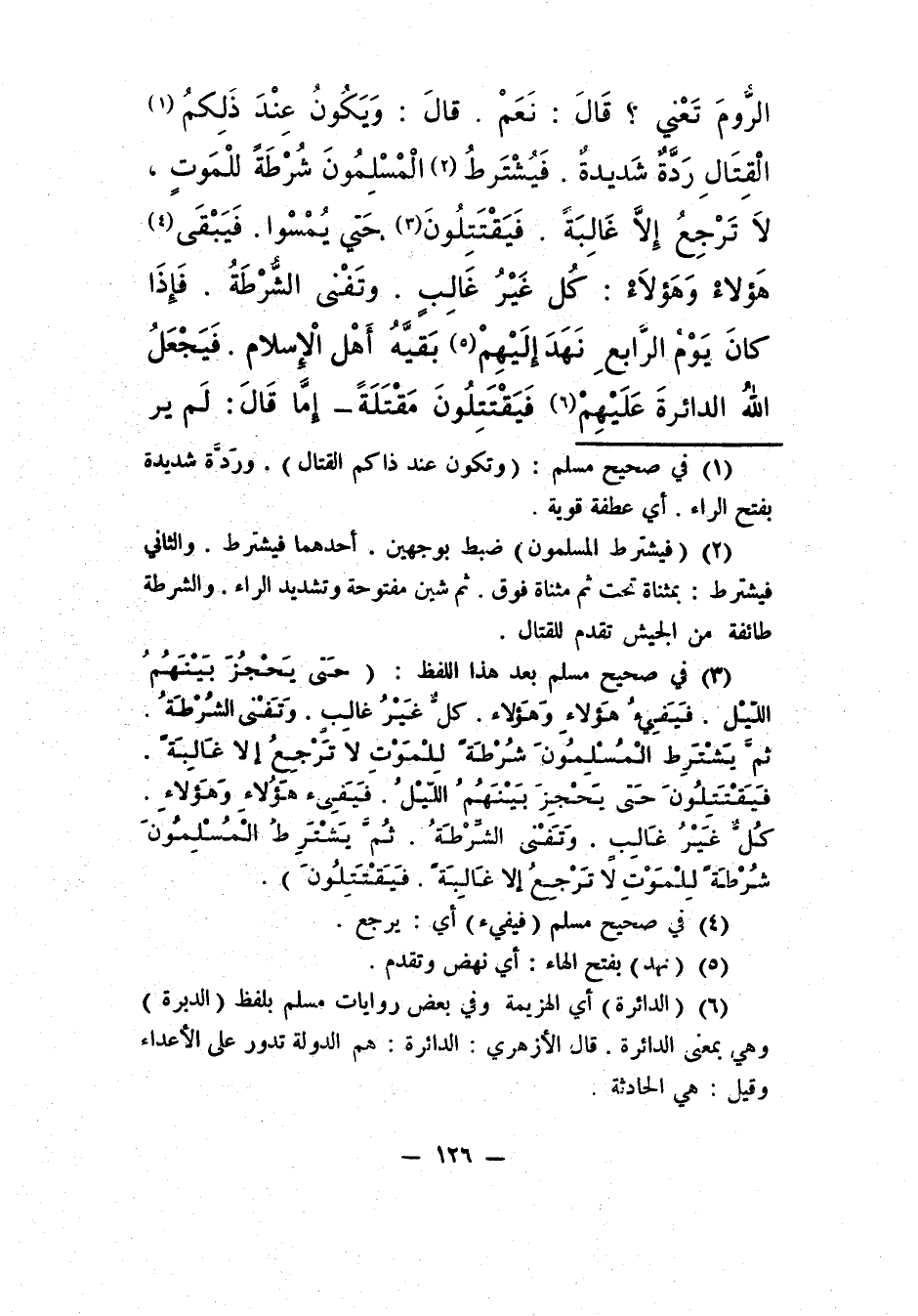 3 في صحيح مسلم بعد هذا اللّفظ: "حَتَّى يَحْجُزَ بَيْنَهُمُ اللَّيل، فَيَفِيئُ هَؤُلاَءِ وهَؤُلاَء كلٌّ غَيْرُ غَالِبٍ. وتَفْنَى الشُّرْطَةُ، ثُمَّ يَشْتَرِط الْمُسْلِمُونَ شُرْطَةً لِلْمَوْتِ لا تَرْجِعُ إِلاَّ غَالِبَة، فَيَقْتَتِلُونَ حَتَّى يَحْجِزَ بَيْنَهُمُ اللَّيْلُ، فَيَفِئ هَؤُلاَء وَهَؤُلاَء، كُلٌّ غَيْرُ غَالِبٍ، وَتَفْنَى الشُّرْطَةُ، ثُمَّ يَشْتَرِطُ الْمُسْلِمُونَ شُرْطَةً لِلْمَوْتِ لاَ تَرْجِعُ إِلاَّ غَالِبَةً، فَيَقْتَتِلُونَ".