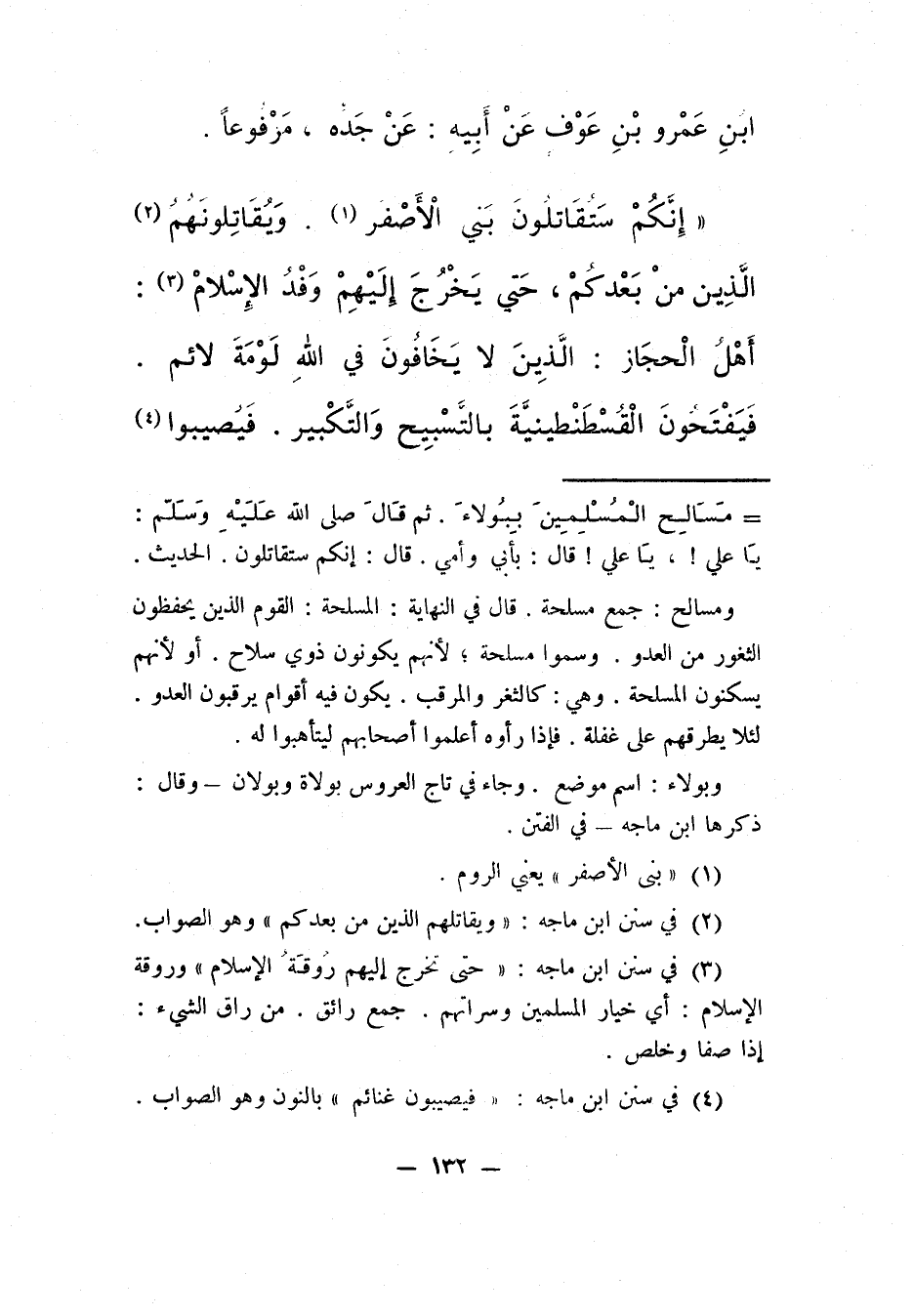 "إنّكُم ستُقَاتِلُون بني الأصْفَر1. ويُقَاتِلُونَهم2 الّذين مِن بعدكم، حتّى يَخْرُجَ إليهم وَفْدُ الإسلام3: أَهْلُ الْحِجَازِ: الّّذين لا يَخَافُون في الله لَوْمَةَ لاَئِمٍ. فَيَفْتَحُون الْقُسْطَنْطِيْنِيَّةِ بِالتَّسْبِيحِ وَالتَّكْبِيْر. فَيُصِيبُوا4