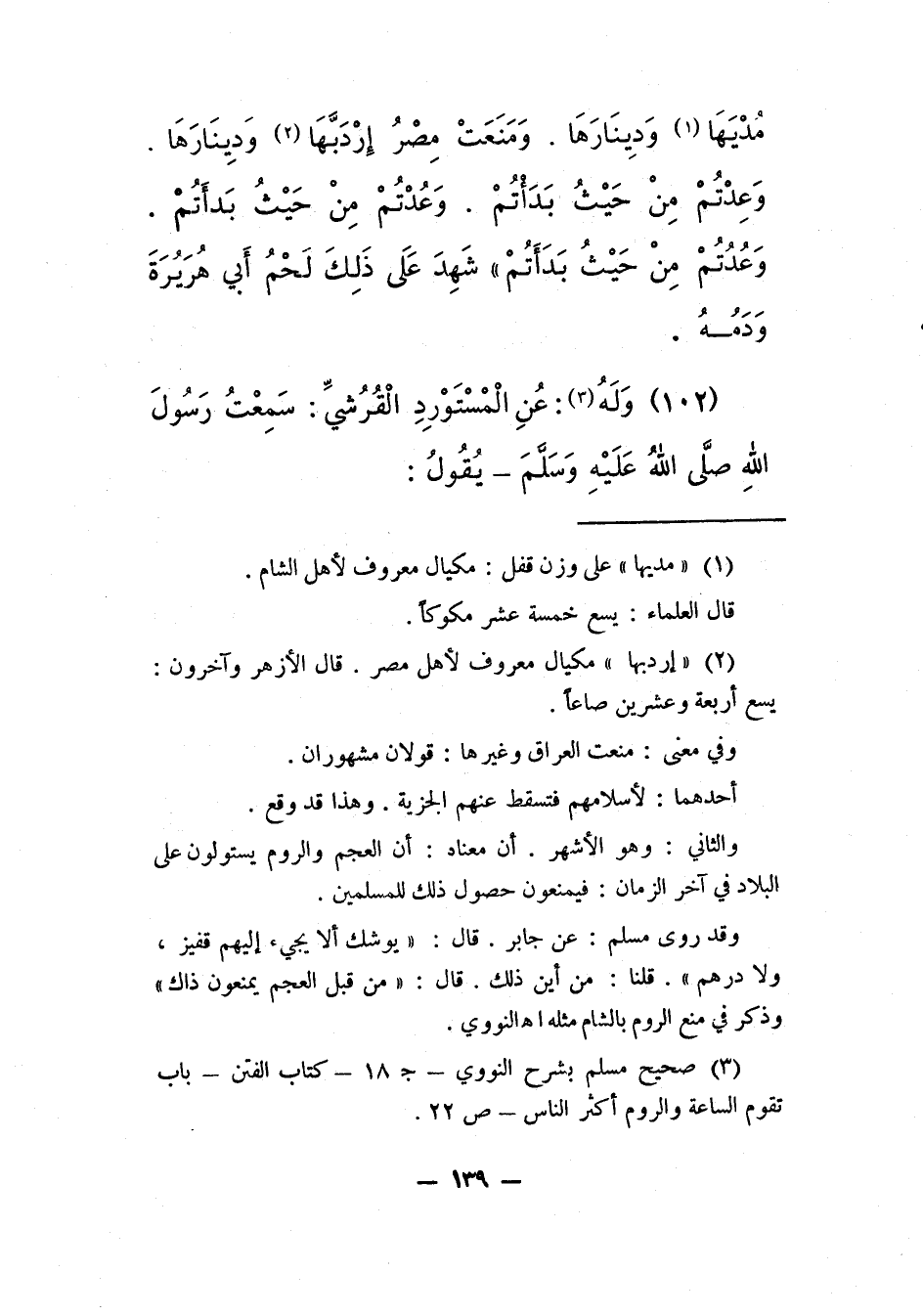 مُدْيَهَا1 وَدِينَارَها، ومَنَعَتْ مِصْرَ إِرْدَبَّها2 وَدِينَارَها، وَعُدْتُم مِنْ حَيْثُ بَدَأْنتم، وَعُدْتُم مِنْ حَيْثُ بَدَأْتُم، وَعُدْتُم مِنْ حَيْثُ بَدَأْتْم " شَهِدَ على ذلك لَحْمُ أبِي هريرة ودمه.