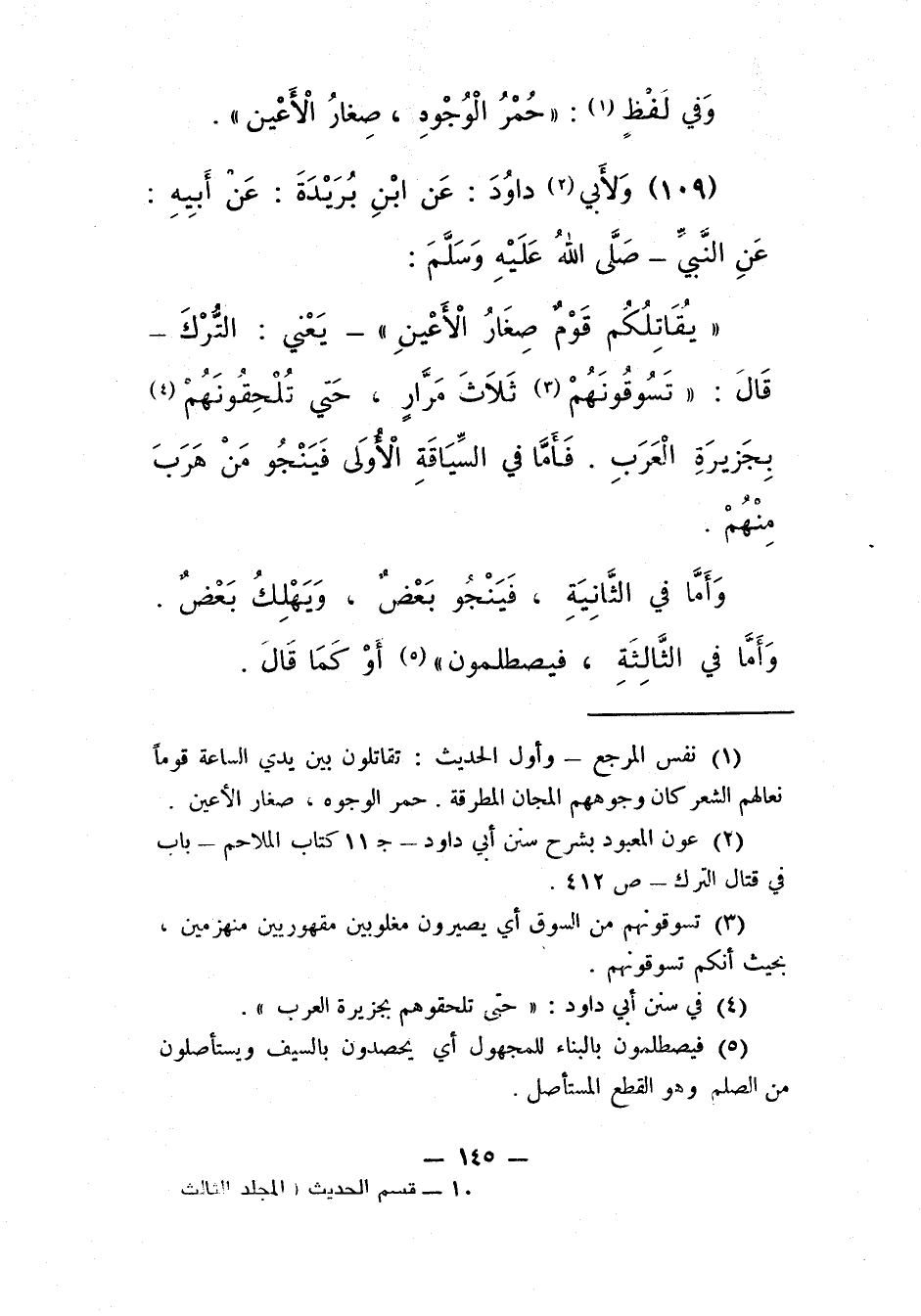 "يُقَاتِلُكُم قومٌ صِغارُ الأَعْيُن" – يعني: التّرك – قال: "تَسُوقُونَهم3 ثَلاثَ مِرَارٍ، حتّى تَلْحَقُونَهم4 بِجَزِيرَةِ الْعَرَب. فَأمّا فِي السِّياقة الأولى فَيَنْجُو مَنْ هَرَبَ مِنْهُم.
