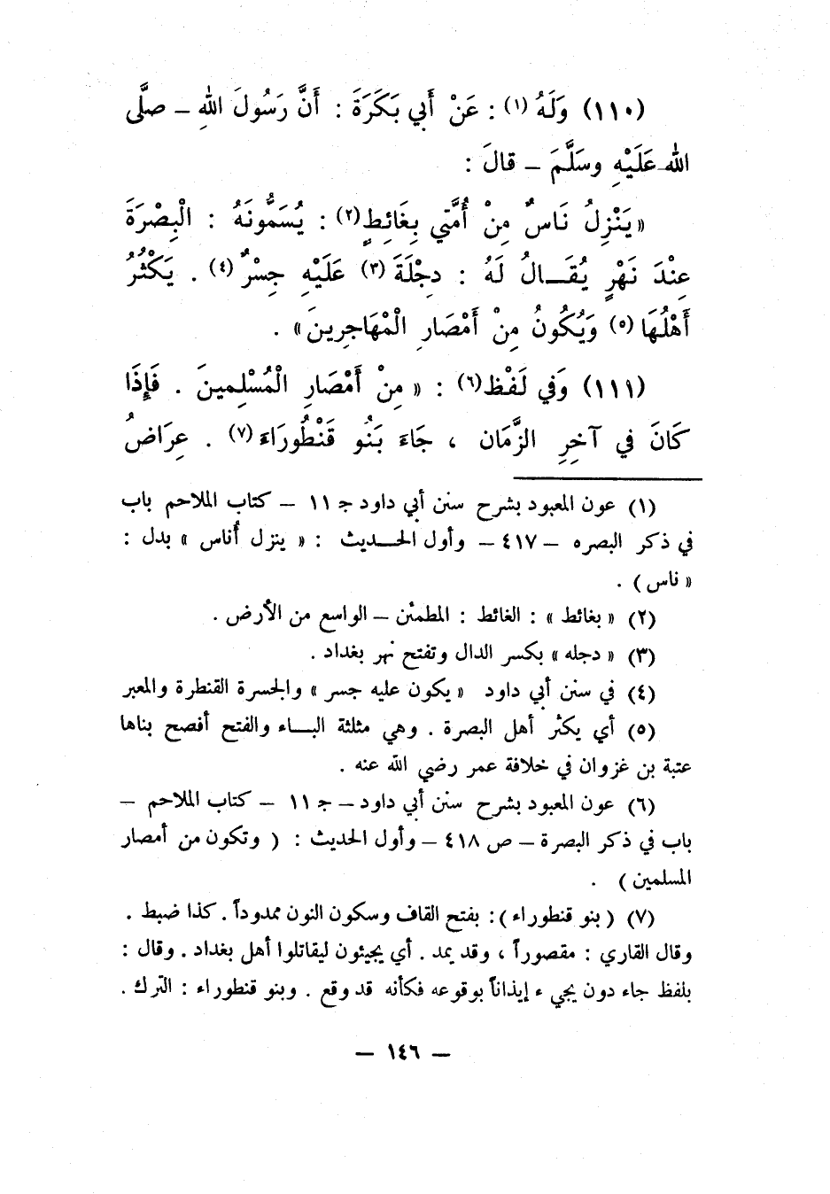 6 عون المعبود، بشرح سنن أبي داود، ج 11، كتاب الملاحم، باب في ذكر البصرة، ص: 418، وأوّل الحديث: "وتكون من أمصار المسلمين".