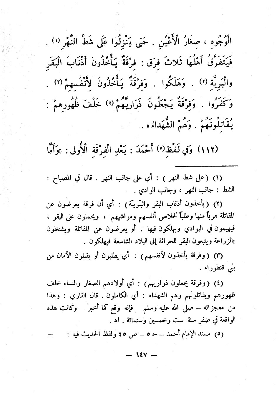 5 مسند الإمام أحمد، ج 5، ص: 45، ولفظ الحديث فيه: عن أبي بَكَرَة، قال: قال رسول الله ـ صلّى الله عليه وسلّم ـ: "لَيَنْزِلَنَّ طَائِفَةٌ مِن أُمَّتِي أَرْضاً يُقَالُ لَهَا: الْبَصْرَةُ، يَكْثُرُ بِهَا عَدَدُهُم، وَيَكْثُرُ بِهَا نَخْلُهُم، ثُمَّ يَجِيءُ بَنُو قَنْطُورَاء: عِرَاضُ الْوُجُوهِ، صِغَارُ الْعُيُونِ، حَتَّى يَنْزِلُوا عَلَى جِسْرٍ لَهُمْ، يُقَالُ لَهُ: دِجْلَةَ، فَيَتَفَرَّقُ الْمُسْلِمُونَ ثَلاَثَ فِرَقٍ، فَأَمَّا فِرْقَةٌ فَيَأْخُذُونَ بِأَذْنَاب الإبل، وَتَلْحَقُ بِالْبَادِيَة، وَهَلَكَتْ، وأَمَّا فِرْقَةٌ فَتَأْخُذُ عَلَى نَفْسِهَا فَكَفَرَتْ، فَهَذِه وَتِلْكَ سَوَاءٌ، وَأَمَّا فِرْقَةٌ فَيَجْعَلُون عِيَالَهُم خَلْفَ ظُهُورِهِم، وَيُقَاتِلُونَ، فَقَتْلاَهُم شُهَدَاءُ، وَيَفْتَحُ الله عَلَى بَقِيَّتِهَا".