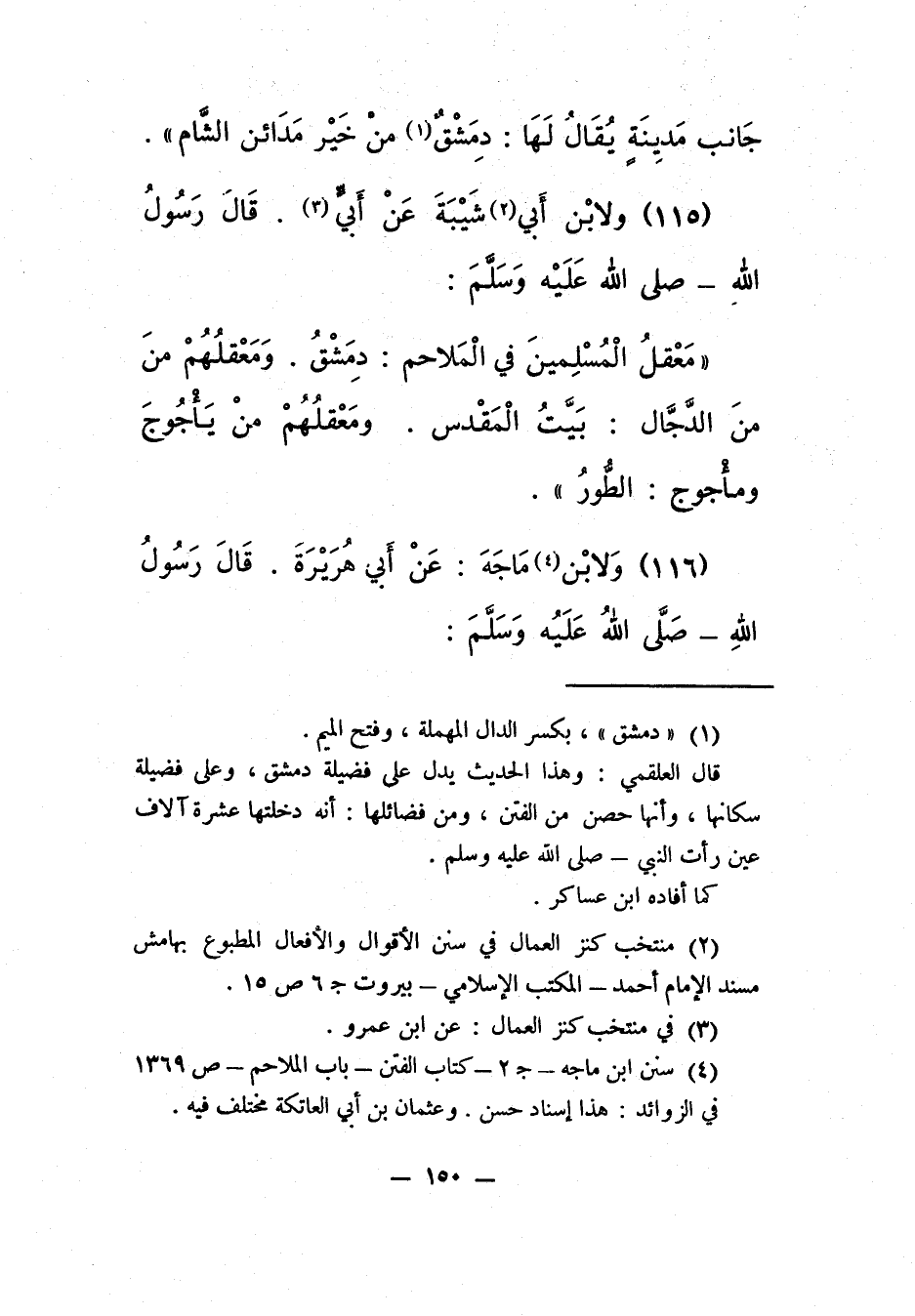 "مَعْقَلُ الْمسلمين فِي الْملاحم: دِمِشْقُ. وَمَعْقلُهُم مِنَ الدّجّال: بَيَّتُ المقدس. ومَعْقُلُهم من يَأْجُوجَ ومَأْجُوجَ: الطُّورُ".