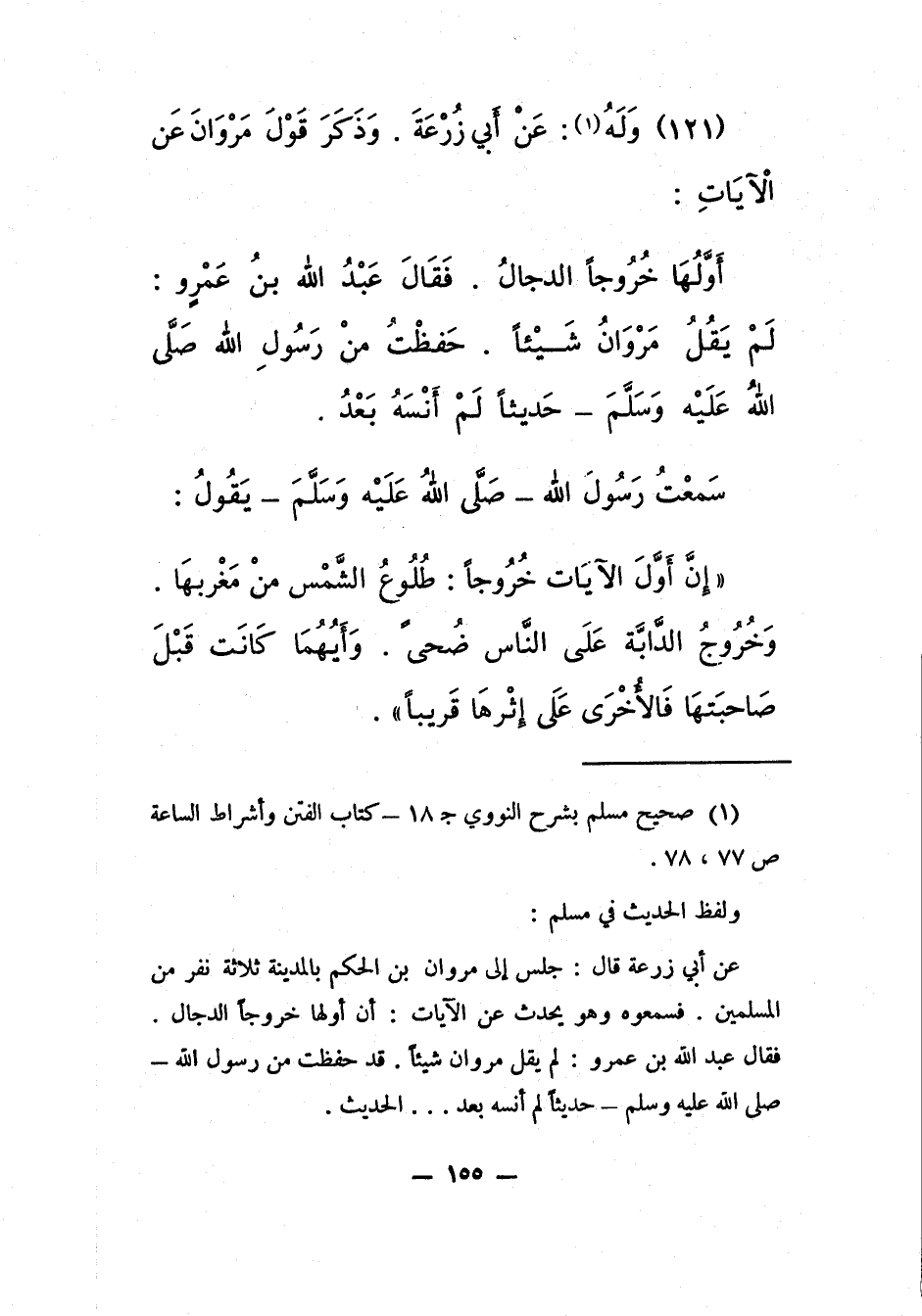"عن أبي زرعة قال: جلس إلَى مروان بن الحكم بالمدينة ثلاثة نفر من المسلمين، فسمعوه وهو يحدّث عن الآيات: إنّ أوّلها خروجاً الدّجّال، فقال عبد الله بن عمرو: لم يقل مروان شيئاً، قد حفظت من رسول الله ـ صلّى الله عليه وسلّم ـ حديثاً لم أنسه بعد ... " الحديث.
