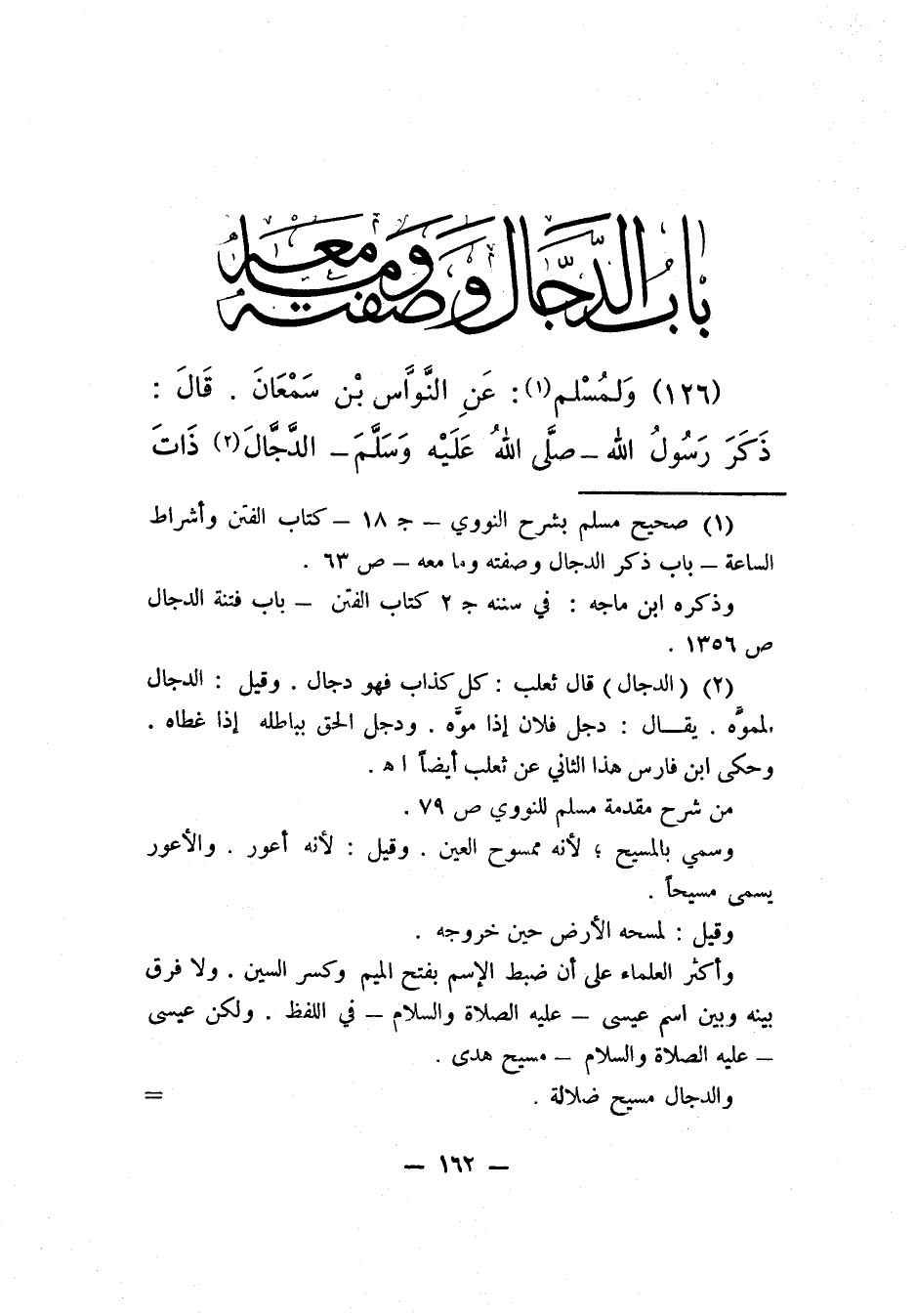 (126) ولِمسلم1: عن النَّوَّاس بن سَمْعَان. قال: ذَكَرَ رسولُ الله – صلّى الله عليه وسلّم- الدَّجَّال2 ذَاتَ