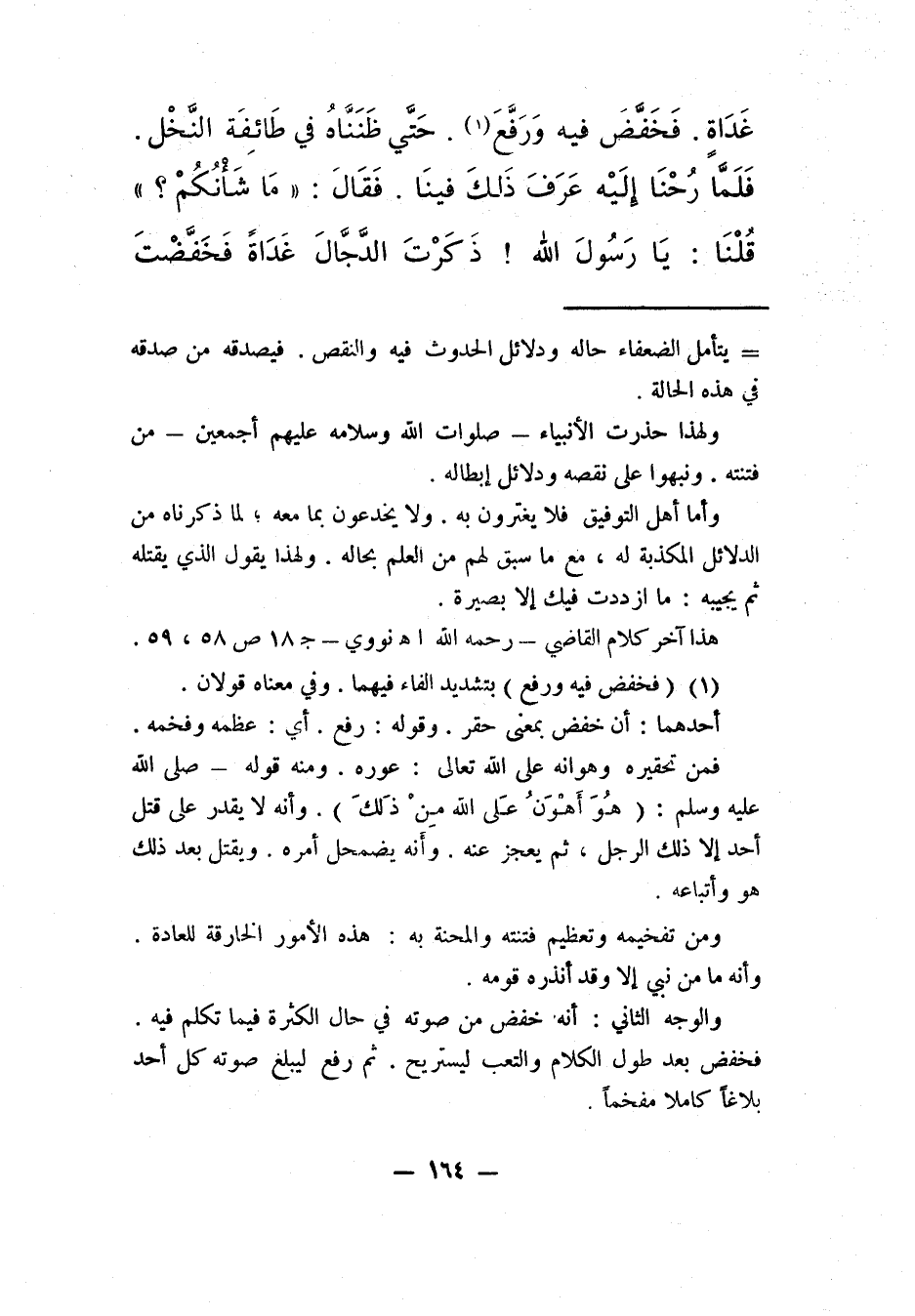 غَدَاةٍ فَخَفَّضَ فِيهِ ورَفَّعَ1، حتّى ظَنَنَّاهُ فِي طَائِفَةِ النَّخْلِ، فلمّا رُحْنَا إليه عَرَفَ ذلك فَينَا. فقال: "مَا شَأْنُكُم؟ "، قلنا: يا رسولَ الله! ذَكَرْتَ الدَّجَّالَ غَدَاةَ فَخَفَّضْتَ