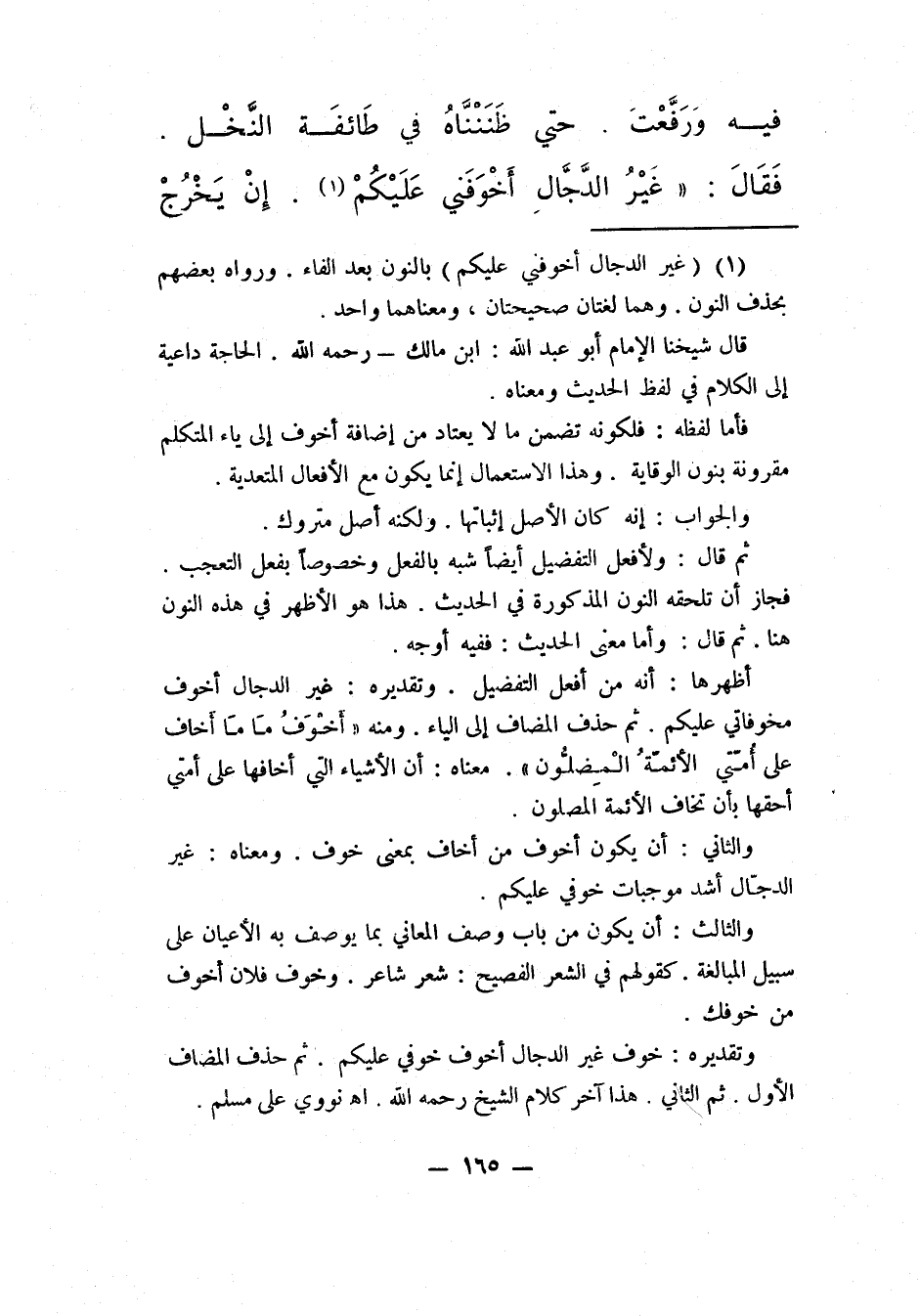 1 "غير الدّجّال أخوفنِي عليكم"، بالنّون بعد الفاء، ورواه بعضهم بحذف النّون، وهما لغتان صحيحتان، ومعناهما واحد.