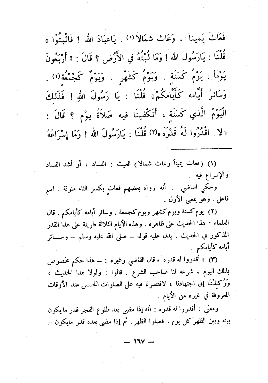 2 يوم كسنة ويوم كشهرٍ ويوم كجمعة، وسائر أيامه كأيامكم، قال العلماء: هذا الحديث على ظاهره، وهذه الأيّام الثّلاثة طويلة على هذا القدر المذكور في الحديث، يدلّ عليه قوله ـ صلّى الله عليه وسلّم ـ وسائر أيّامه كأيّامكم.