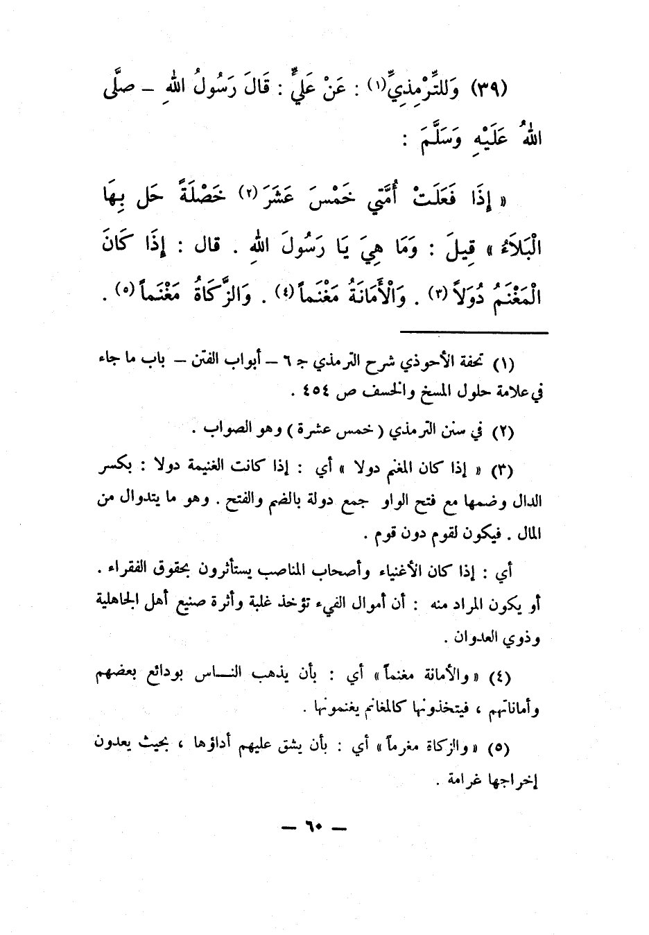 "إِذَا فَعَلَتْ أُمَّتِي خَمْسَ عَشَرَ2 خِصْلَةً حَلَّ بِهَا الْبَلاَءْ"، قيل: وما هي يا رسولَ الله. قال: إذا كان الْمَغْنَمُ دُوَلاً3، والأَمَانَةُ مَغْنَماً4، والزّكاةُ مَغْرَماً5،
