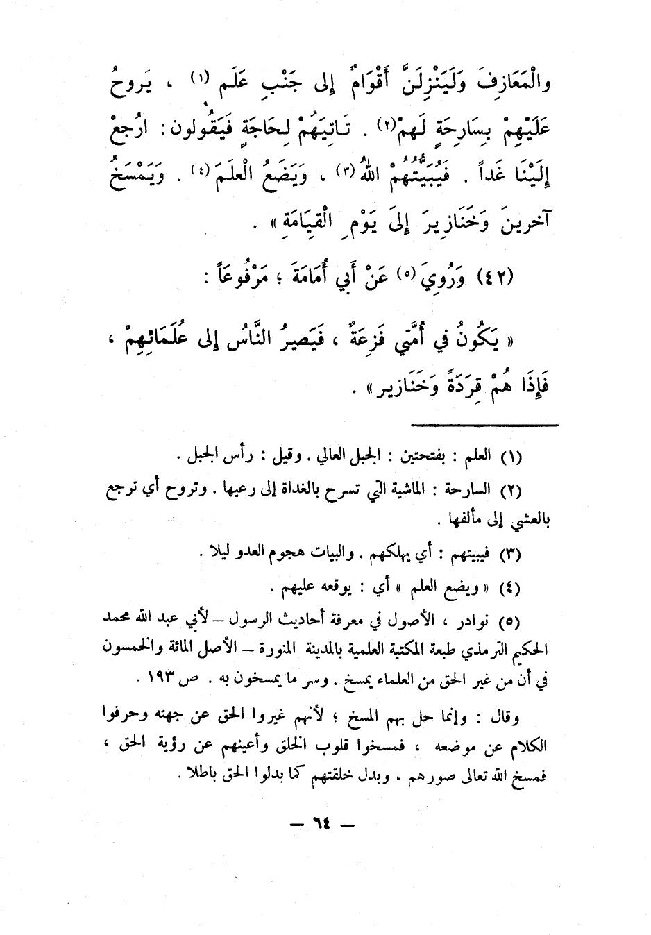 وَالْمَعَازِفَ، وَلَيَنْزِلَنَّ أَقْوامٌ إلِى جَنْبِ عِلْمٍ1، يَروحُ عَلَيْهُم بِسَارِحَةٍ لَهُم2، تَأْتِيهُم لِحَاجَةٍ فَيَقُولُونَ: ارْجِعْ إِلَيْنَا غَداً. فَيُبَيِّتُهُمُ الله3، وَيَضَعُ الْعِلْمَ4، وَيَمْسَخُ آخرين وخَنَازِيرَ إلَى يَومِ الْقِيَامَةِ".