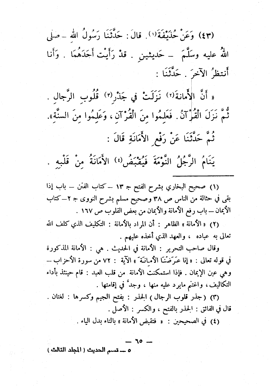 1 صحيح البخاري بشرح الفتح جـ 13 – كتاب الفتن – باب إذا بقي في حثالة من الناس ص 38 وصحيح مسلم بشرح النووي جـ2 – كتاب الأيمان – باب رفع الأمانة والأيمان من بعض القلوب ص 167.