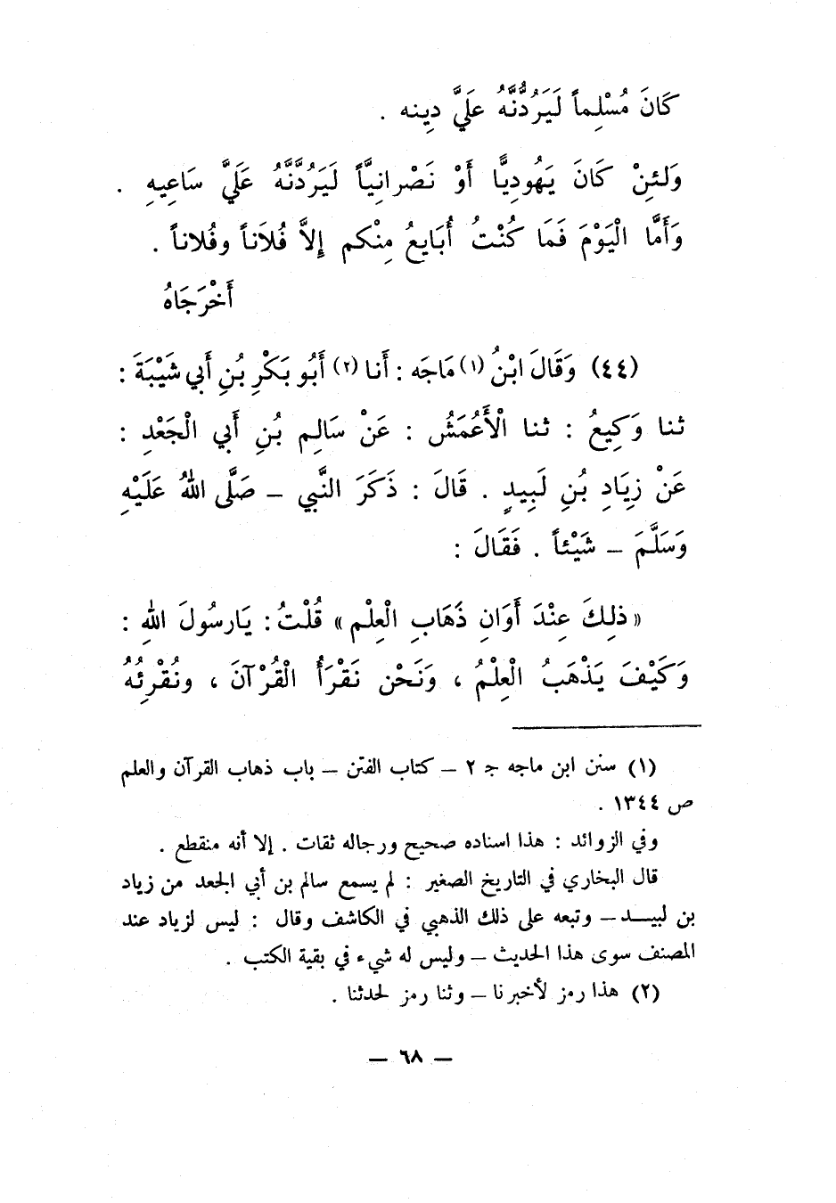 (44) وقال ابْنُ ماجه1: أنا2 أبو بكر بن أبِي شَيْبَةَ: ثنا وكيعُ: ثنا الأَعْمَشُ: عن سالِم بن أبِي الْجَعْدِ: عن زَيَادِ بن لَبِيدٍ. قال: ذكر النَّبِيُّ – صلّى الله عليه وسلّم - شيئاً. فقال: