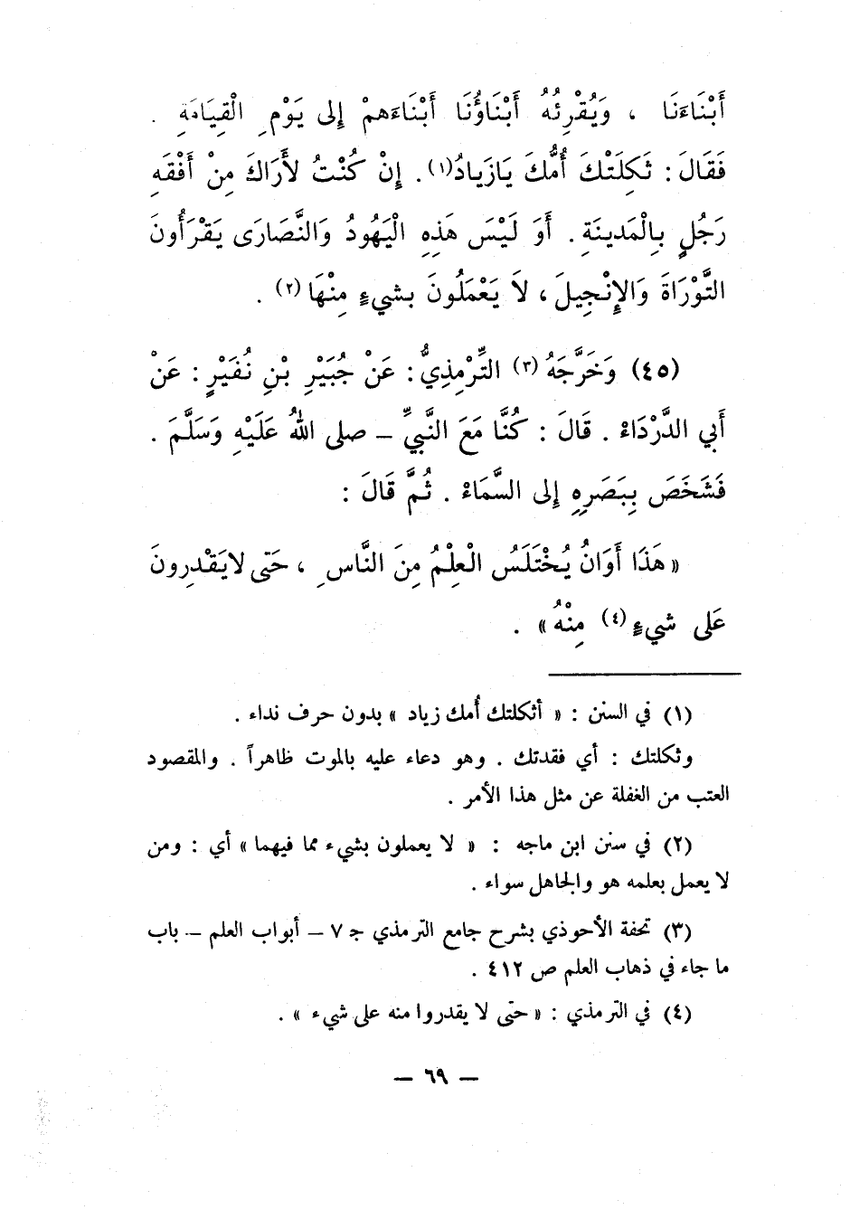 (45) وخرّجه التِّرمذي3: عن جُبَيْر بن نُفَيْرٍ عن أبِي الدَّرْدَاءِ. قال: كنّا مع النَّبِيِّ – صلّى الله عليه وسلّم - فَشَخَصَ بَصَرُهُ إلِى السَّمَاءِ. ثمّ قال: