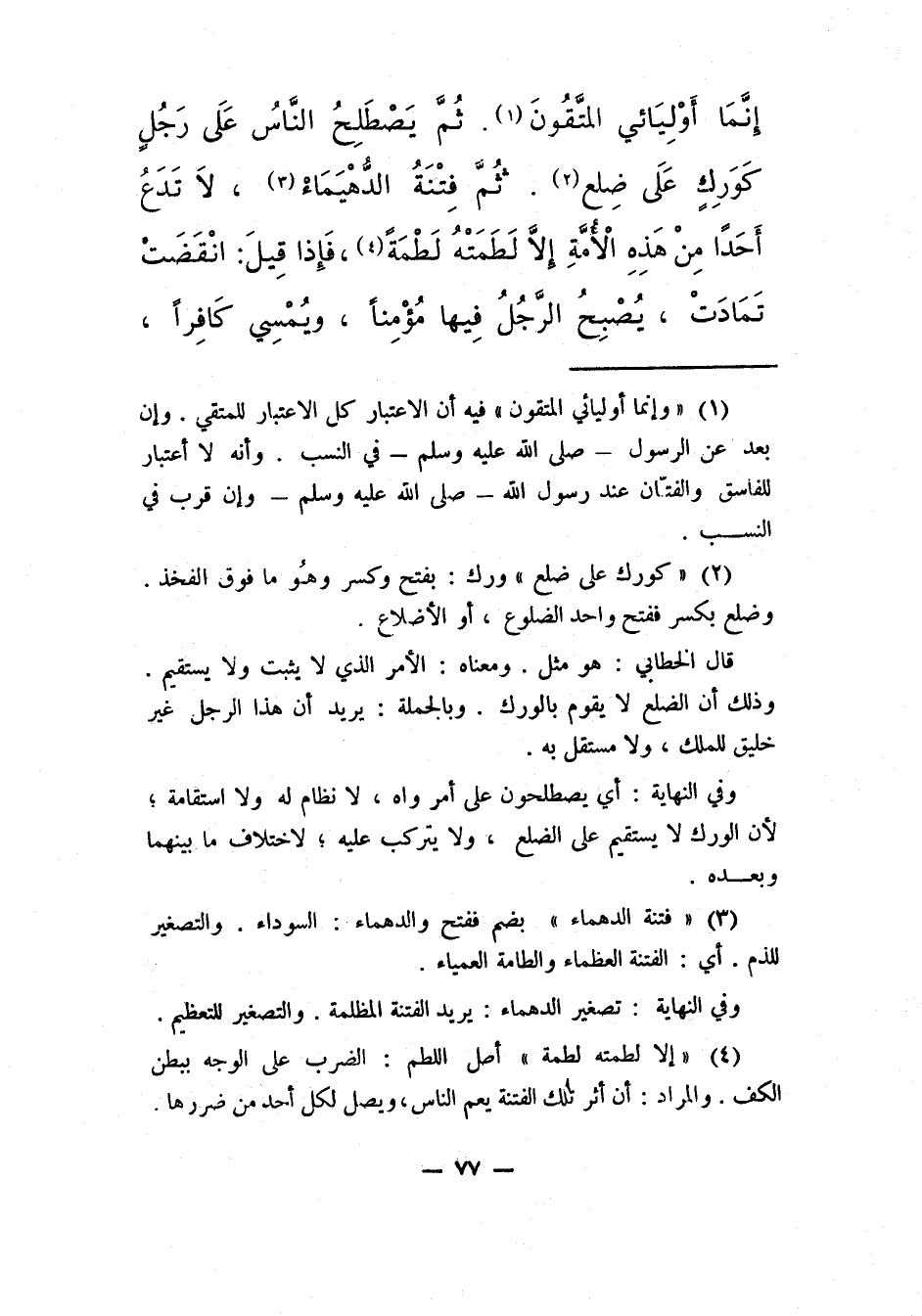إِنَّمَا أَوْلَيَائِي الْمُتَّقُون1. ثُمَّ يَصْطَلِحُ النّاسُ علَى رَجُلٍ كَوَرَكٍ عَلَى ضِلْعٍ2. ثُمَّ فِتْنَةُالدُّهْيَمَاءِ،3 لا تَدَعُ أَحداًً مِن هِذِهِ الأمّةِ إلاّ لَطَمَتْهُ لَطْمَةً4، فَإِذَا قِيلَ: انْقَضَتْ تَمَادَتْ، يُصْبِحُ الرَّجُلُ فيهَا مُؤْمِناً، وَيُمْسِي كاَفراً،