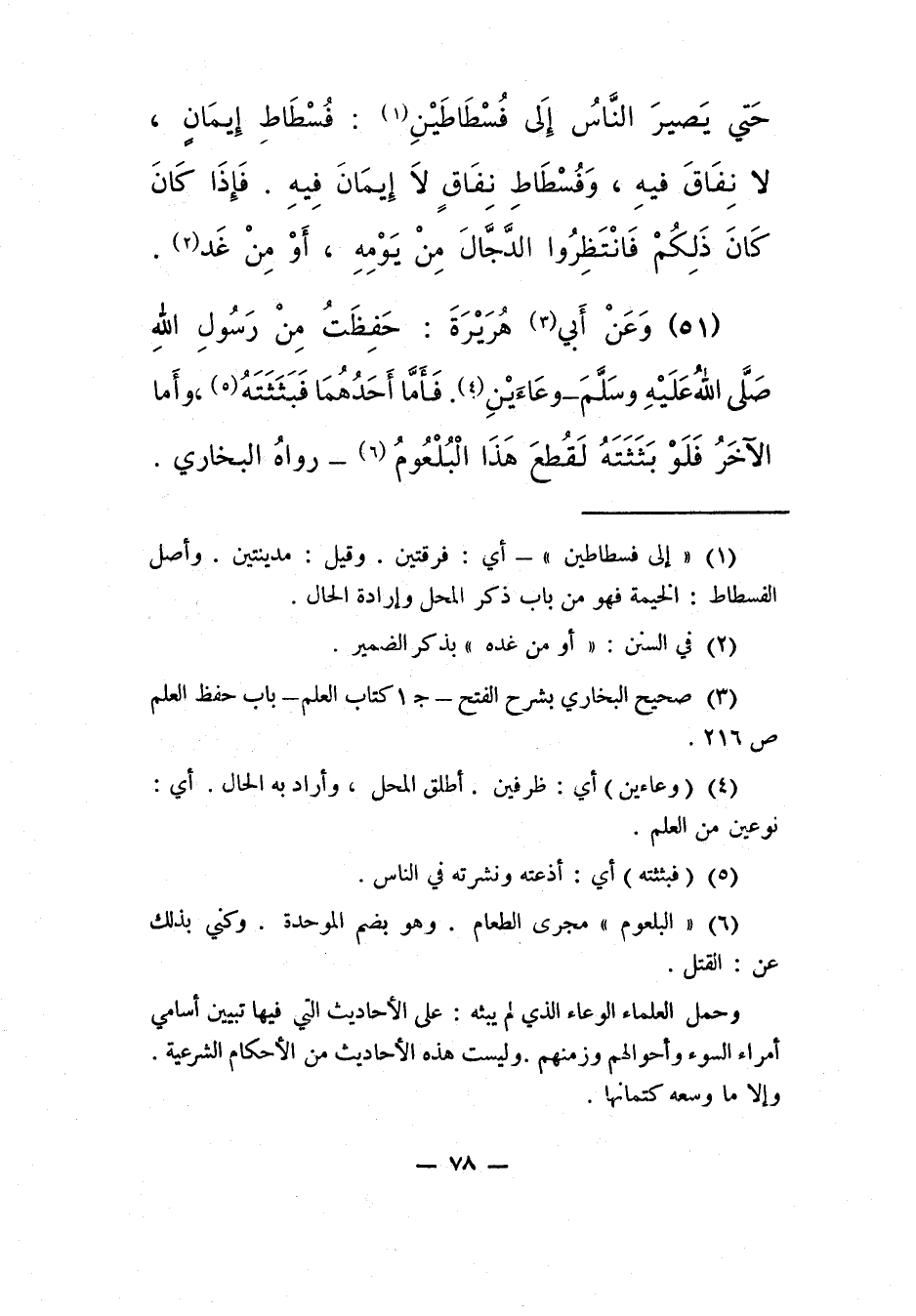 (51) وعن أبِي3 هُرَيْرَةَ: حَفِظْتُ من رسولِ الله – صلّى الله عليه وسلّم - وعَاءَيْن4. فَأمَّا أَحَدُهُما فَبَثَثْتُه5، وأمَّا الآخرُ فَلَو بَثَثَتُهُ لَقُطِعَ هَذَا الْبَلْعُومُ6– رواه البخاري.
