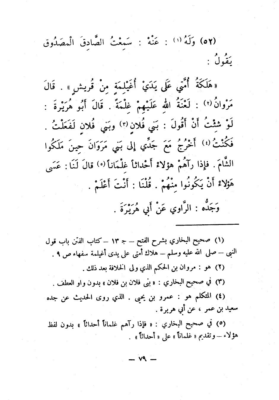 1 صحيح البخاري بشرح الفتح – جـ 13 – كتاب الفتن باب قول النبي – صلى الله عليه وسلّم – هلاك أمتي على يدي أغليمة سفهاء ص9.