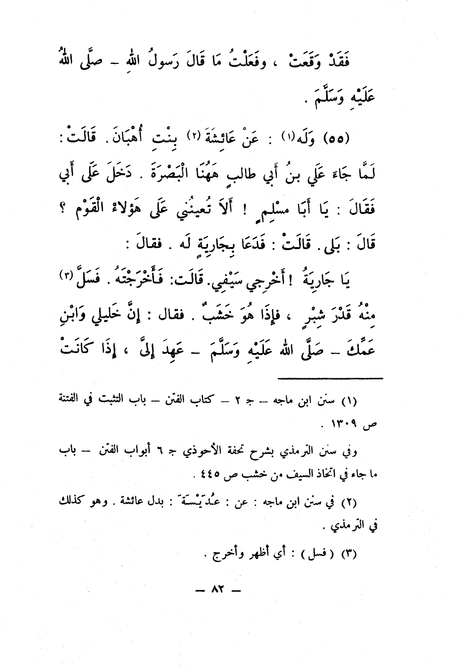 (55) وَلَهُ1: عن عَائِشَةَ2 بِنْتِ أُهْبَانَ. قَالَتْ لَمَّا جَاءَ عَلِيُّ ابنُ أَبِي طَالِبٍ هَهُنَا الْبَصْرَةَ، دَخَلَ عَلَى أبِي فَقَالَ: يا أبا مسلمٍ! أَلاَ تُعِينُنِي عَلَى هَؤُلاَءِ الَقَومِ؟ قَالَ: بَلَى. قالت: فَدَعَا بِجَارِيَةٍ لَهُ. فقال: