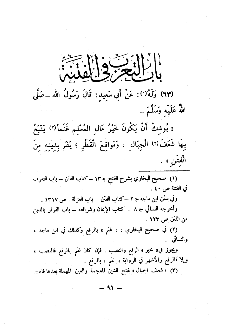 "يُوْشِكُ أَنْ يَكَونَ خَيْرُ مَالِ الْمُسْلِمِ غَنَماً2 يَتْبَعُ بِهَا شَعَفَ3 الْجِبَالِ، وَمَوَاقِعَ الْقَطْرِ؛ يَفِرُّ بِدِيْنِهِ مِنَ الْفِتَنِ".