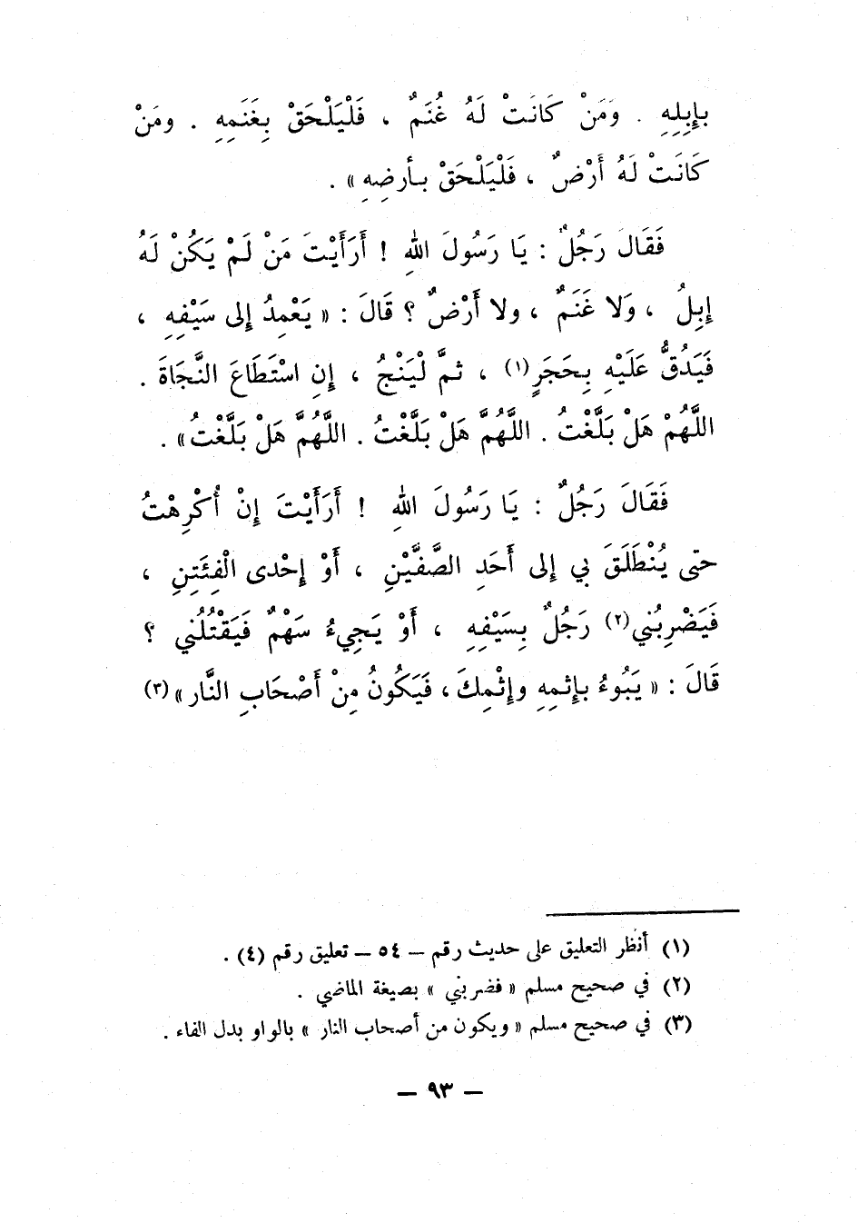 قال: "يَعْمِدُ إِلَى سَيْفِهِ، فَيَدُقُّ عَلَيهْ بِحَجَرٍ1، ثُمَّ لِيَنْجُ، إِنْ اسْتَطاَعَ النَّجَاةَ. اللَّهُمَّ هَلْ بَلَّغْتُ. اللَّهُمَّ هَلْ بَلَّغْتُ. اللَّهُمَّ هَلْ بَلَّغْتُ".
