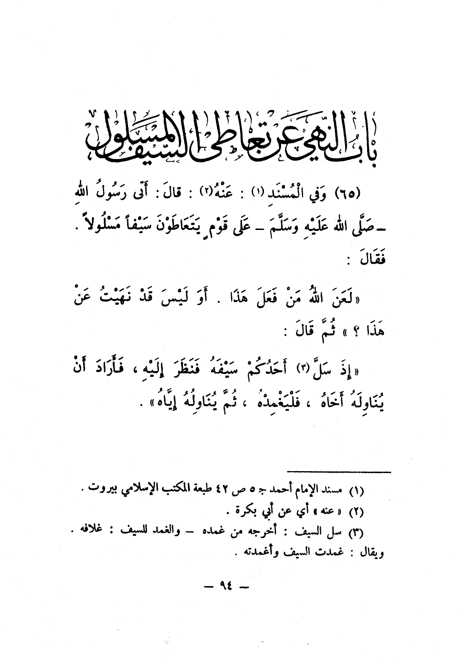 (65) وفِي الْمُسْنَدِ1: عنه2: قال: أتى رسولُ الله – صلّى الله عليه وسلّم - عَلَى قَومٍ يَتَعَاطَونَ سَيفاً مَسْلُولاً. فقال: