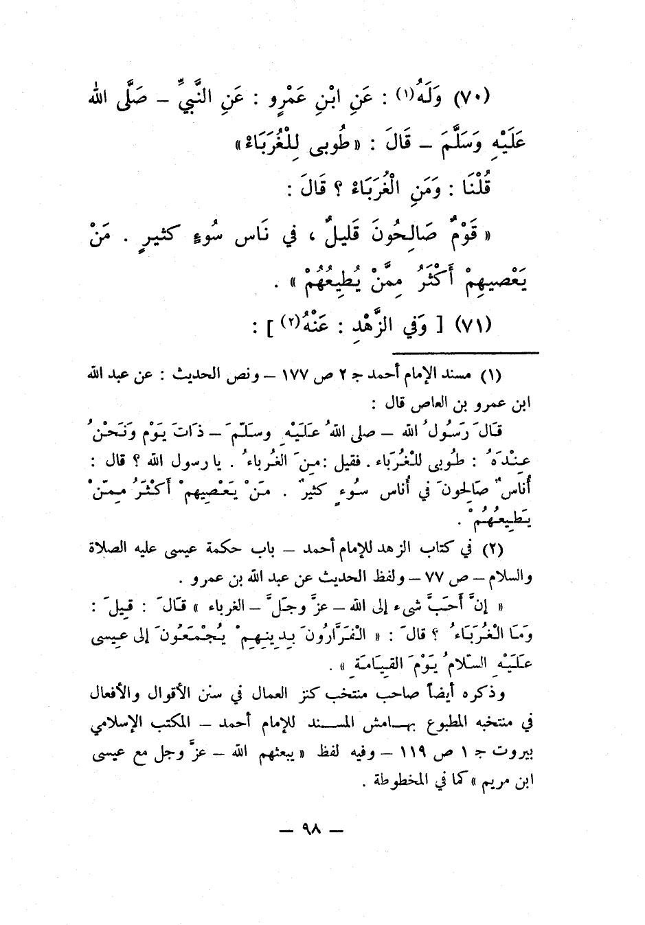 (70) وله1: عن ابن عمرو: عن النَّبِيِّ – صلّى الله عليه وسلّم - قال: "طَوبَى لِلْغُرَبَاءِ ".