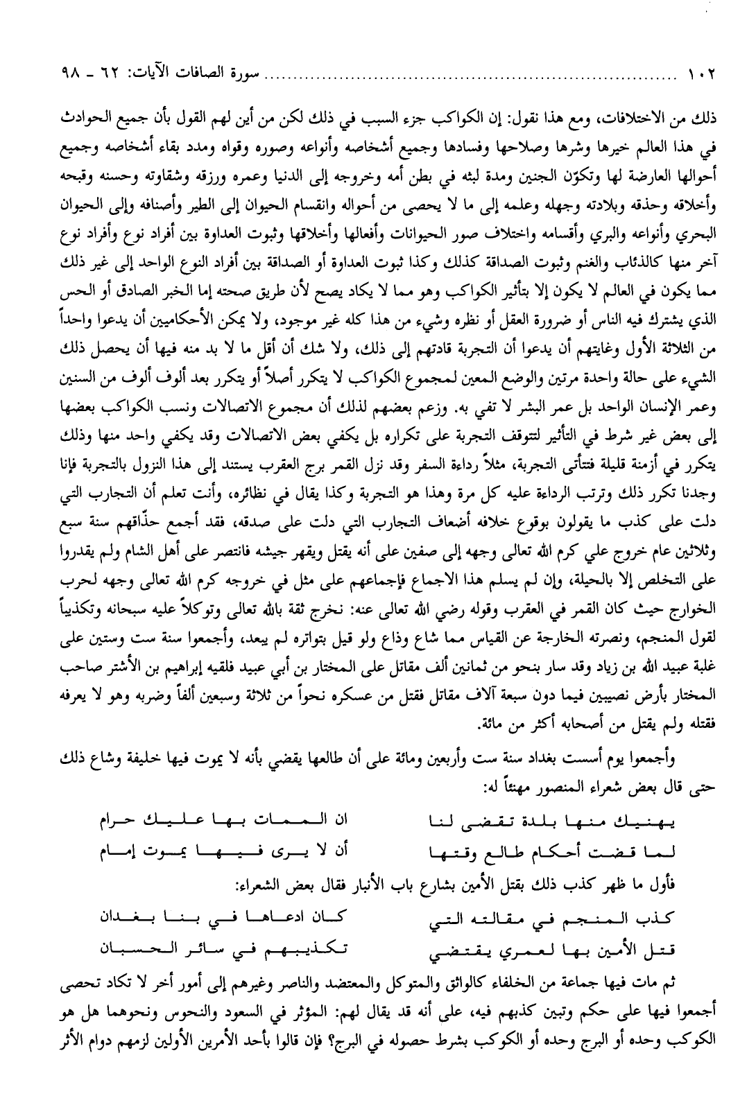 ثم مات فيها جماعة من الخلفاء كالواثق والمتوكل والمعتضد والناصر وغيرهم إلى أمور أخر لا تكاد تحصى أجمعوا فيها على حكم وتبين كذبهم فيه، على أنه قد يقال لهم: المؤثر في السعود والنحوس ونحوهما هل هو الكوكب وحده أو البرج وحده أو الكوكب بشرط حصوله في البرج؟ فإن قالوا بأحد الأمرين الأولين لزمهم دوام الأثر
