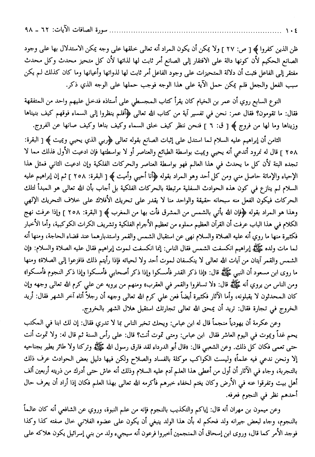 258] قال له نمرود أتدعي أنه يحيي ويميت بواسطة الطبائع والعناصر أو لا بواسطتها فإن ادعيت الأول فذلك مما لا تجده البتة لأن كل ما يحدث في هذا العالم فهو بواسطة العناصر والحركات الفلكية وإن ادعيت الثاني فمثل هذا الإحياء والإماتة حاصل مني ومن كل أحد وهو المراد بقوله أَنَا أُحْيِي وَأُمِيتُ [البقرة: 258] ثم إن إبراهيم عليه السلام لم ينازع في كون هذه الحوادث السفلية مرتبطة بالحركات الفلكية بل أجاب بأن الله تعالى هو المبدأ لتلك الحركات فيكون الفعل منه سبحانه حقيقة والواحد منا لا يقدر على تحريك الأفلاك على خلاف التحريك الإلهي وهذا هو المراد بقوله فَإِنَّ اللَّهَ يَأْتِي بِالشَّمْسِ مِنَ الْمَشْرِقِ فَأْتِ بِها مِنَ الْمَغْرِبِ [البقرة: 258] وإذا عرفت نهج الكلام في هذا الباب عرفت أن القرآن العظيم مملوء من تعظيم الأجرام الفلكية وتشريف الكرات الكوكبية، وأما الأخبار فكثيرة منها ما روي أنه عليه الصلاة والسلام نهى عن استقبال الشمس والقمر واستدبارهما عند قضاء الحاجة، ومنها أنه