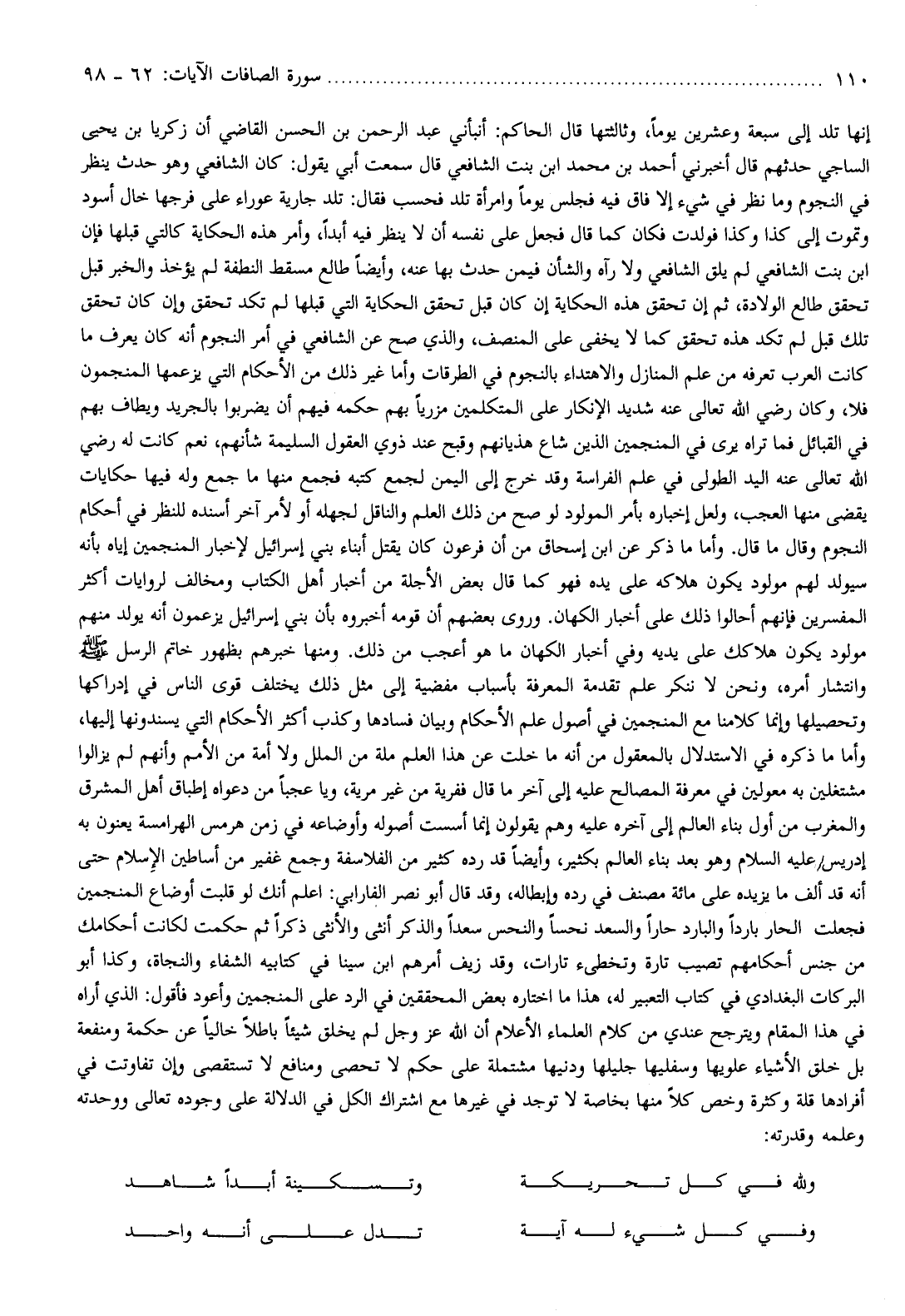 على المتكلمين مزريا بهم حكمه فيهم أن يضربوا بالجريد ويطاف بهم في القبائل فما تراه يرى في المنجمين الذين شاع هذيانهم وقبح عند ذوي العقول السليمة شأنهم، نعم كانت له رضي الله تعالى عنه اليد الطولى في علم الفراسة وقد خرج إلى اليمن لجمع كتبه فجمع منها ما جمع وله فيها حكايات يقضى منها العجب، ولعل إخباره بأمر المولود لو صح من ذلك العلم والناقل لجهله أو لأمر آخر أسنده للنظر في أحكام النجوم وقال ما قال. وأما ما ذكر عن ابن إسحاق من أن فرعون كان يقتل أبناء بني إسرائيل لإخبار المنجمين إياه بأنه سيولد لهم مولود يكون هلاكه على يده فهو كما قال بعض الأجلة من أخبار أهل الكتاب ومخالف لروايات أكثر المفسرين فإنهم أحالوا ذلك على أخبار الكهان. وروى بعضهم أن قومه أخبروه بأن بني إسرائيل يزعمون أنه يولد منهم مولود يكون هلاكك على يديه وفي أخبار الكهان ما هو أعجب من ذلك. ومنها خبرهم بظهور خاتم الرسل صلّى الله عليه وسلم وانتشار أمره، ونحن لا ننكر علم تقدمة المعرفة بأسباب مفضية إلى مثل ذلك يختلف قوى الناس في إدراكها وتحصيلها وإنما كلامنا مع المنجمين في أصول علم الأحكام وبيان فسادها وكذب أكثر الأحكام التي يسندونها إليها، وأما ما ذكره في الاستدلال بالمعقول من أنه ما خلت عن هذا العلم ملة من الملل ولا أمة من الأمم وأنهم لم يزالوا مشتغلين به معولين في معرفة المصالح عليه إلى آخر ما قال ففرية من غير مرية، ويا عجبا من دعواه إطباق أهل المشرق والمغرب من أول بناء العالم إلى آخره عليه وهم يقولون إنما أسست أصوله وأوضاعه في زمن هرمس الهرامسة يعنون به إدريس عليه السلام وهو بعد بناء العالم بكثير، وأيضا قد رده كثير من الفلاسفة وجمع غفير من أساطين الإسلام حتى أنه قد ألف ما يزيده على مائة مصنف في رده وإبطاله، وقد قال أبو نصر الفارابي: اعلم أنك لو قلبت أوضاع المنجمين فجعلت الحار باردا والبارد حارا والسعد نحسا والنحس سعدا والذكر أنثى والأنثى ذكرا ثم حكمت لكانت أحكامك من جنس أحكامهم تصيب تارة وتخطىء تارات، وقد زيف أمرهم ابن سينا في كتابيه الشفاء والنجاة، وكذا أبو البركات البغدادي في كتاب التعبير له، هذا ما اختاره بعض المحققين في الرد على المنجمين وأعود فأقول: الذي أراه في هذا المقام ويترجح عندي من كلام العلماء الأعلام أن الله عز وجل لم يخلق شيئا باطلا خاليا عن حكمة ومنفعة بل خلق الأشياء علويها وسفليها جليلها ودنيها مشتملة على حكم لا تحصى ومنافع لا تستقصى وإن تفاوتت في أفرادها قلة وكثرة وخص كلا منها بخاصة لا توجد في غيرها مع اشتراك الكل في الدلالة على وجوده تعالى ووحدته وعلمه وقدرته:
