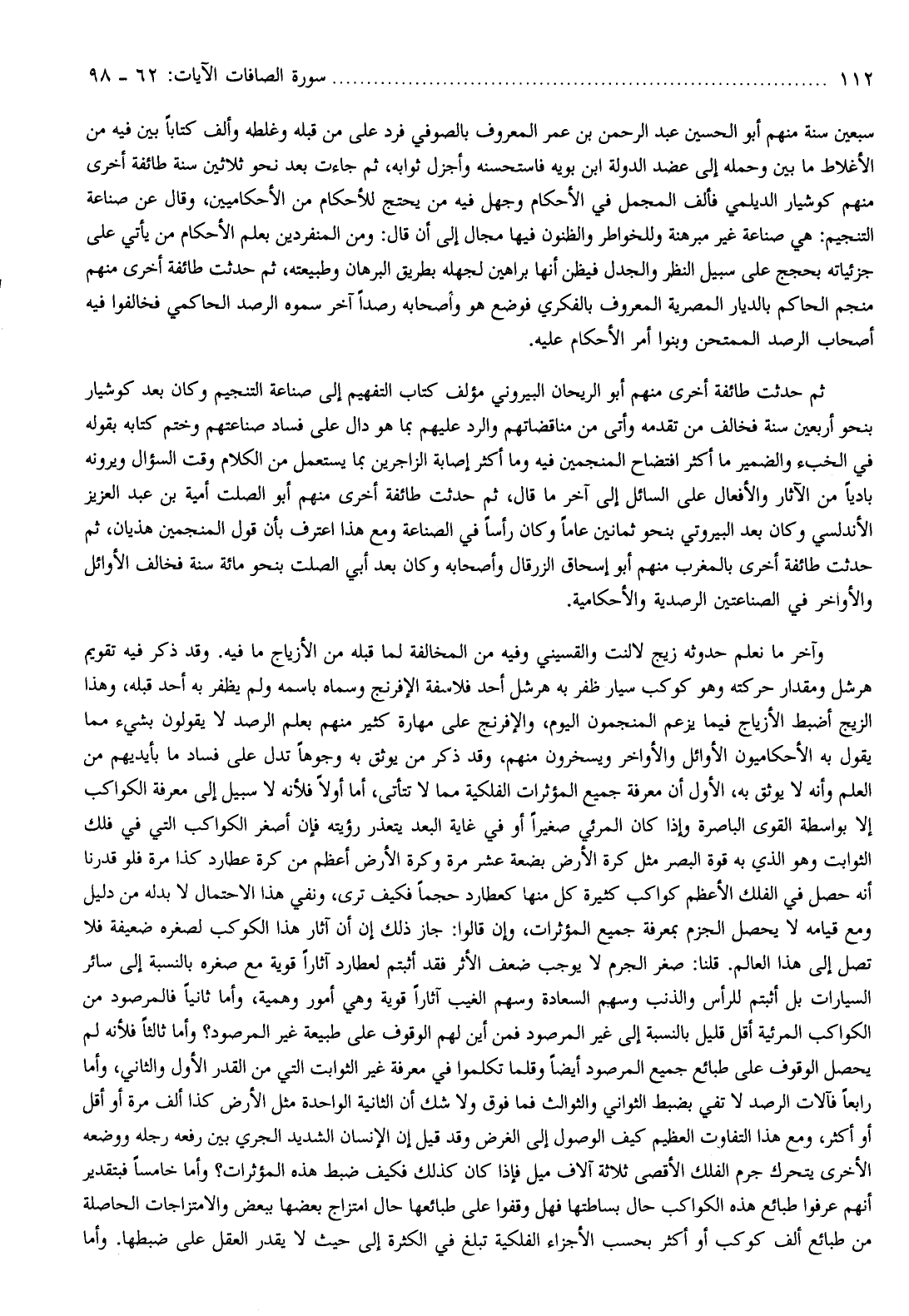 سبعين سنة منهم أبو الحسين عبد الرحمن بن عمر المعروف بالصوفي فرد على من قبله وغلطه وألف كتابا بين فيه من الأغلاط ما بين وحمله إلى عضد الدولة ابن بويه فاستحسنه وأجزل ثوابه، ثم جاءت بعد نحو ثلاثين سنة طائفة أخرى منهم كوشيار الديلمي فألف المجمل في الأحكام وجهل فيه من يحتج للأحكام من الأحكاميين، وقال عن صناعة التنجيم: هي صناعة غير مبرهنة وللخواطر والظنون فيها مجال إلى أن قال: ومن المنفردين بعلم الأحكام من يأتي على جزئياته بحجج على سبيل النظر والجدل فيظن أنها براهين لجهله بطريق البرهان وطبيعته، ثم حدثت طائفة أخرى منهم منجم الحاكم بالديار المصرية المعروف بالفكري فوضع هو وأصحابه رصدا آخر سموه الرصد الحاكمي فخالفوا فيه أصحاب الرصد الممتحن وبنوا أمر الأحكام عليه.