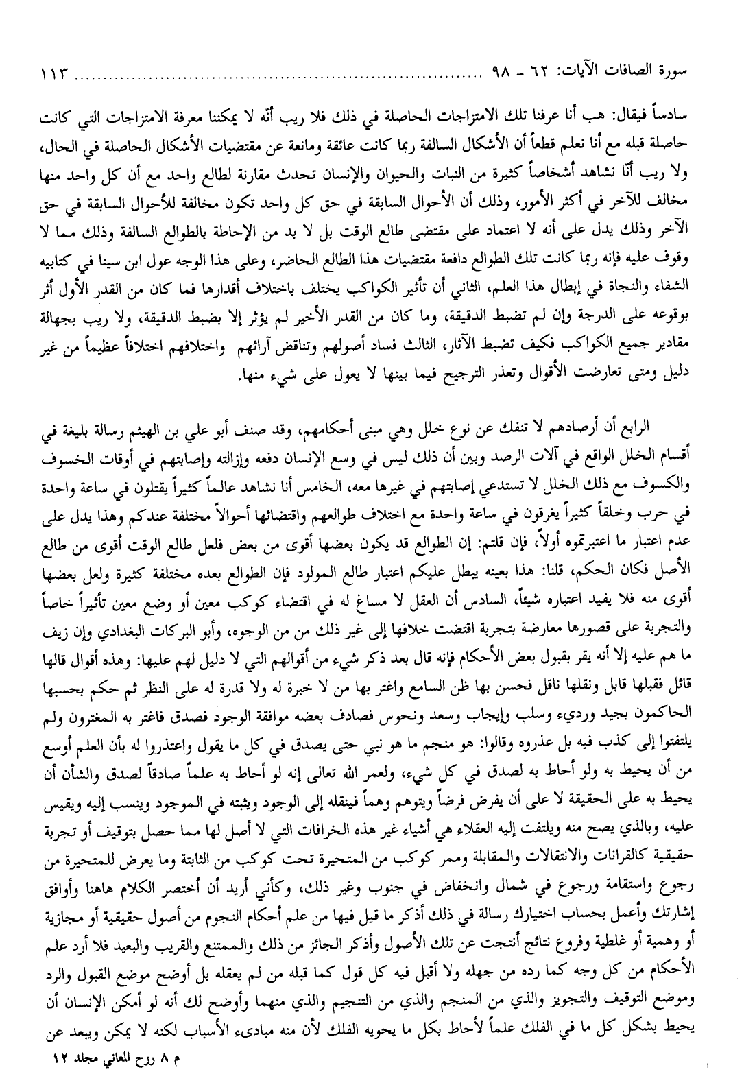 الرابع أن أرصادهم لا تنفك عن نوع خلل وهي مبنى أحكامهم، وقد صنف أبو علي بن الهيثم رسالة بليغة في أقسام الخلل الواقع في آلات الرصد وبين أن ذلك ليس في وسع الإنسان دفعه وإزالته وإصابتهم في أوقات الخسوف والكسوف مع ذلك الخلل لا تستدعي إصابتهم في غيرها معه، الخامس أنا نشاهد عالما كثيرا يقتلون في ساعة واحدة في حرب وخلقا كثيرا يغرقون في ساعة واحدة مع اختلاف طوالعهم واقتضائها أحوالا مختلفة عندكم وهذا يدل على عدم اعتبار ما اعتبرتموه أولا، فإن قلتم: إن الطوالع قد يكون بعضها أقوى من بعض فلعل طالع الوقت أقوى من طالع الأصل فكان الحكم، قلنا: هذا بعينه يبطل عليكم اعتبار طالع المولود فإن الطوالع بعده مختلفة كثيرة ولعل بعضها أقوى منه فلا يفيد اعتباره شيئا، السادس أن العقل لا مساغ له في اقتضاء كوكب معين أو وضع معين تأثيرا خاصا والتجربة على قصورها معارضة بتجربة اقتضت خلافها إلى غير ذلك من من الوجوه، وأبو البركات البغدادي وإن زيف ما هم عليه إلا أنه يقر بقبول بعض الأحكام فإنه قال بعد ذكر شيء من أقوالهم التي لا دليل لهم عليها: وهذه أقوال قالها قائل فقبلها قابل ونقلها ناقل فحسن بها ظن السامع واغتر بها من لا خبرة له ولا قدرة له على النظر ثم حكم بحسبها الحاكمون بجيد ورديء وسلب وإيجاب وسعد ونحوس فصادف بعضه موافقة الوجود فصدق فاغتر به المغترون ولم يلتفتوا إلى كذب فيه بل عذروه وقالوا: هو منجم ما هو نبي حتى يصدق في كل ما يقول واعتذروا له بأن العلم أوسع من أن يحيط به ولو أحاط به لصدق في كل شيء، ولعمر الله تعالى إنه لو أحاط به علما صادقا لصدق والشأن أن يحيط به على الحقيقة لا على أن يفرض فرضا ويتوهم وهما فينقله إلى الوجود ويثبته في الموجود وينسب إليه ويقيس عليه، وبالذي يصح منه ويلتفت إليه العقلاء هي أشياء غير هذه الخرافات التي لا أصل لها مما حصل بتوقيف أو تجربة حقيقية كالقرانات والانتقالات والمقابلة وممر كوكب من المتحيرة تحت كوكب من الثابتة وما يعرض للمتحيرة من رجوع واستقامة ورجوع في شمال وانخفاض في جنوب وغير ذلك، وكأني أريد أن أختصر الكلام هاهنا وأوافق إشارتك وأعمل بحساب اختيارك رسالة في ذلك أذكر ما قيل فيها من علم أحكام النجوم من أصول حقيقية أو مجازية أو وهمية أو غلطية وفروع نتائج أنتجت عن تلك الأصول وأذكر الجائز من ذلك والممتنع والقريب والبعيد فلا أرد علم الأحكام من كل وجه كما رده من جهله ولا أقبل فيه كل قول كما قبله من لم يعقله بل أوضح موضع القبول والرد وموضع التوقيف والتجويز والذي من المنجم والذي من التنجيم والذي منهما وأوضح لك أنه لو أمكن الإنسان أن يحيط بشكل كل ما في الفلك علما لأحاط بكل ما يحويه الفلك لأن منه مبادئ الأسباب لكنه لا يمكن ويبعد عن
