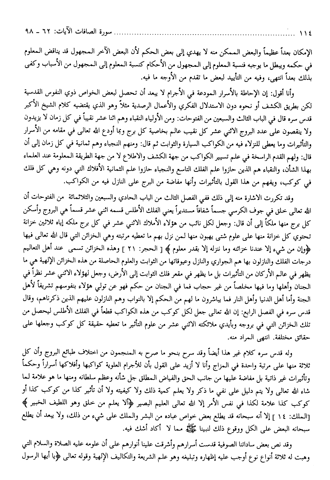 وأنا أقول: إن الإحاطة بالأسرار المودعة في الأجرام لا يبعد أن تحصل لبعض الخواص ذوي النفوس القدسية لكن بطريق الكشف أو نحوه دون الاستدلال الفكري والأعمال الرصدية مثلا وهو الذي يقتضيه كلام الشيخ الأكبر قدس سره قال في الباب الثالث والسبعين من الفتوحات: ومن الأولياء النقباء وهم اثنا عشر نقيبا في كل زمان لا يزيدون ولا ينقصون على عدد البروج الاثني عشر كل نقيب عالم بخاصية كل برج وبما أودع الله تعالى في مقامه من الأسرار والتأثيرات وما يعطى للنزلاء فيه من الكواكب السيارة والثوابت ثم قال: ومنهم النجباء وهم ثمانية في كل زمان إلى أن قال: ولهم القدم الراسخة في علم تسيير الكواكب من جهة الكشف والاطلاع لا من جهة الطريقة المعلومة عند العلماء بهذا الشأن، والنقباء هم الذين حازوا علم الفلك التاسع والنجباء حازوا علم الثمانية الأفلاك التي دونه وهي كل فلك في كوكب، ويفهم من هذا القول بالتأثيرات وأنها مفاضة من البرج على النازل فيه من الكواكب.