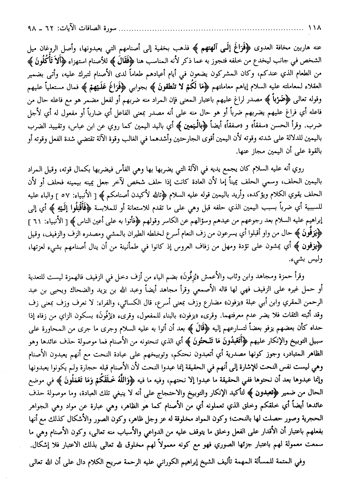 عنه هاربين مخافة العدوى فَراغَ إِلى آلِهَتِهِمْ فذهب بخفية إلى أصنامهم التي يعبدونها، وأصل الروغان ميل الشخص في جانب ليخدع من خلفه فتجوز به عما ذكر لأنه المناسب هنا فَقالَ للأصنام استهزاء أَلا تَأْكُلُونَ من الطعام الذي عندكم، وكان المشركون يضعون في أيام أعيادهم طعاما لدى الأصنام لتبرك عليه، وأتى بضمير العقلاء لمعاملته عليه السلام إياهم معاملتهم ما لَكُمْ لا تَنْطِقُونَ بجوابي فَراغَ عَلَيْهِمْ فمال مستعليا عليهم وقوله تعالى ضَرْباً مصدر لراغ عليهم باعتبار المعنى فإن المراد منه ضربهم أو لفعل مضمر هو مع فاعله حال من فاعله أي فراغ عليهم يضربهم ضربا أو هو حال منه على أنه مصدر بمعنى الفاعل أي ضاربا أو مفعول له أي لأجل ضرب. وقرأ الحسن «سفقا» و «صفقا» أيضا بِالْيَمِينِ أي باليد اليمين كما روي عن ابن عباس، وتقييد الضرب باليمين للدلالة على شدته وقوته لأن اليمين أقوى الجارحتين وأشدهما في الغالب وقوة الآلة تقتضي شدة الفعل وقوته أو بالقوة على أن اليمين مجاز عنها.