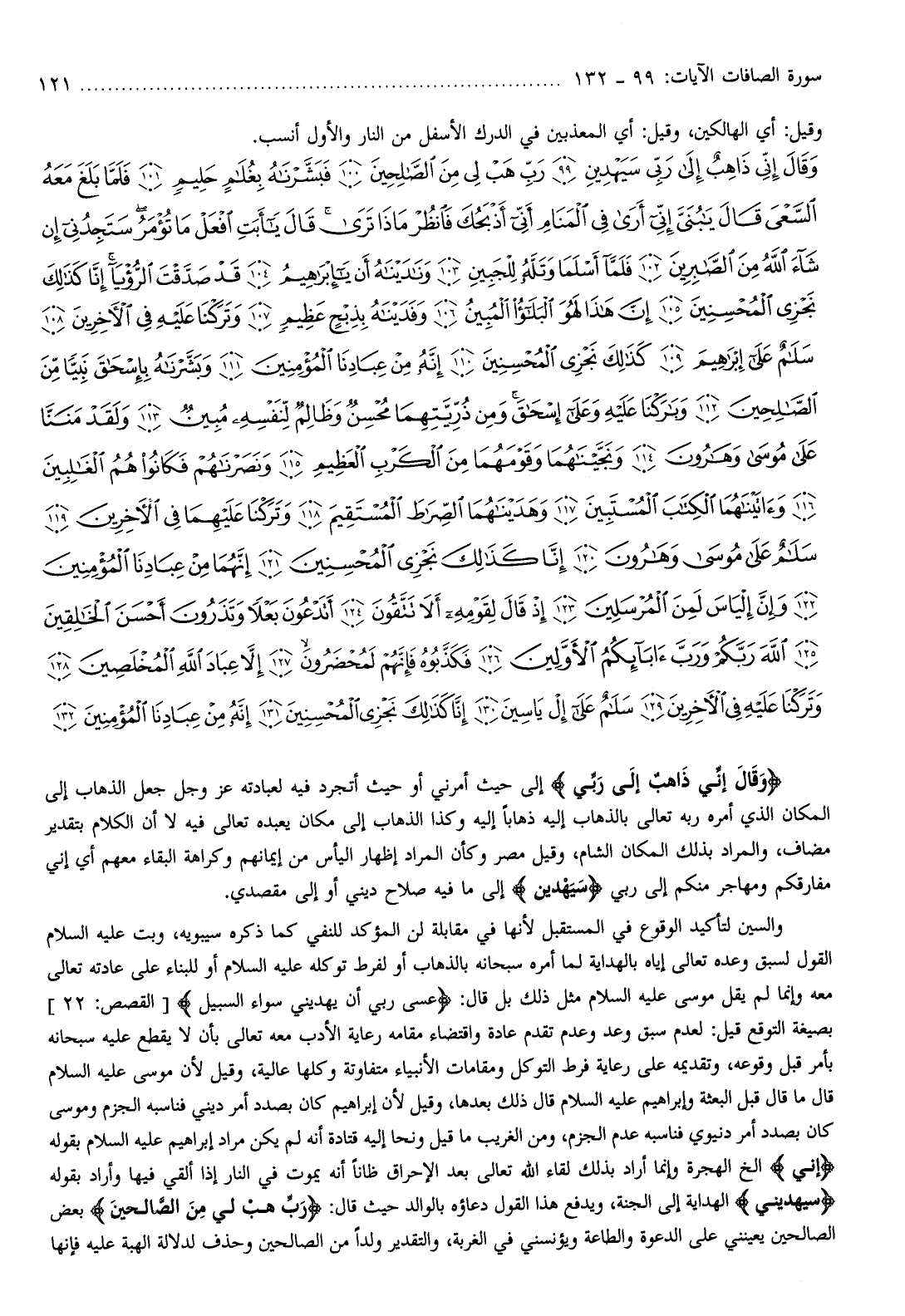 وَقالَ إِنِّي ذاهِبٌ إِلى رَبِّي إلى حيث أمرني أو حيث أتجرد فيه لعبادته عز وجل جعل الذهاب إلى المكان الذي أمره ربه تعالى بالذهاب إليه ذهابا إليه وكذا الذهاب إلى مكان يعبده تعالى فيه لا أن الكلام بتقدير مضاف، والمراد بذلك المكان الشام، وقيل مصر وكأن المراد إظهار اليأس من إيمانهم وكراهة البقاء معهم أي إني مفارقكم ومهاجر منكم إلى ربي سَيَهْدِينِ إلى ما فيه صلاح ديني أو إلى مقصدي.