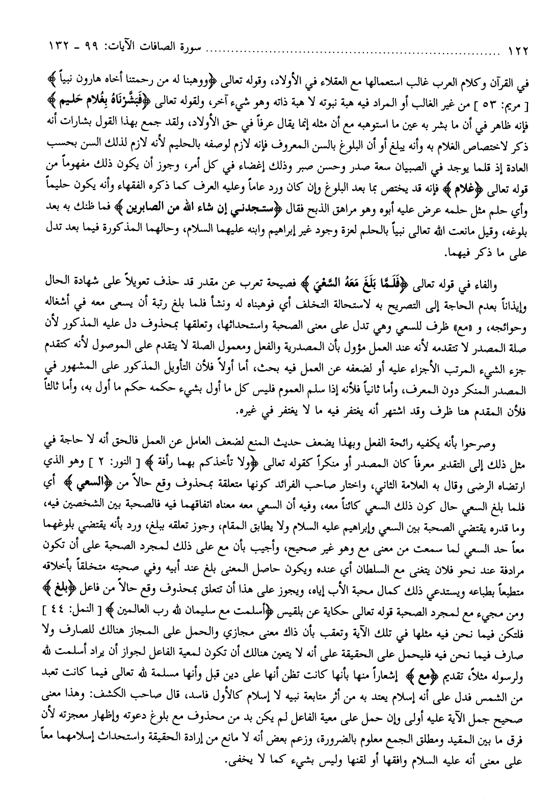 وصرحوا بأنه يكفيه رائحة الفعل وبهذا يضعف حديث المنع لضعف العامل عن العمل فالحق أنه لا حاجة في مثل ذلك إلى التقدير معرفا كان المصدر أو منكرا كقوله تعالى وَلا تَأْخُذْكُمْ بِهِما رَأْفَةٌ [النور: 2] وهو الذي ارتضاه الرضى وقال به العلامة الثاني، واختار صاحب الفرائد كونها متعلقة بمحذوف وقع حالا من السَّعْيَ أي فلما بلغ السعي حال كون ذلك السعي كائنا معه، وفيه أن السعي معه معناه اتفاقهما فيه فالصحبة بين الشخصين فيه، وما قدره يقتضي الصحبة بين السعي وإبراهيم عليه السلام ولا يطابق المقام، وجوز تعلقه ببلغ، ورد بأنه يقتضي بلوغهما معا حد السعي لما سمعت من معنى مع وهو غير صحيح، وأجيب بأن مع على ذلك لمجرد الصحبة على أن تكون مرادفة عند نحو فلان يتغنى مع السلطان أي عنده ويكون حاصل المعنى بلغ عند أبيه وفي صحبته متخلقا بأخلاقه متطبعا بطباعه ويستدعي ذلك كمال محبة الأب إياه، ويجوز على هذا أن تتعلق بمحذوف وقع حالا من فاعل بَلَغَ ومن مجيء مع لمجرد الصحبة قوله تعالى حكاية عن بلقيس سْلَمْتُ مَعَ سُلَيْمانَ لِلَّهِ رَبِّ الْعالَمِينَ