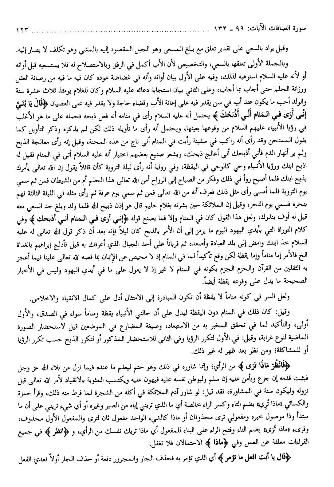 وبالجملة الأولى تعلقها بالسعي، والتخصيص لأن الأب أكمل في الرفق وبالاستصلاح له فلا يستسعيه قبل أوانه أو لأنه عليه السلام استوهبه لذلك، وفيه على الأول بيان أوانه وأنه في غضاضة عوده كان فيه ما فيه من رصانة العقل ورزانة الحلم حتى أجاب بما أجاب، وعلى الثاني بيان استجابة دعائه عليه السلام وكان للغلام يومئذ ثلاث عشرة سنة والولد أحب ما يكون عند أبيه في سن يقدر فيه على إعانة الأب وقضاء حاجة ولا يقدر فيه على العصيان قالَ يا بُنَيَّ إِنِّي أَرى فِي الْمَنامِ أَنِّي أَذْبَحُكَ يحتمل أنه عليه السلام رأى في منامه أنه فعل ذبحه فحمله على ما هو الأغلب في رؤيا الأنبياء عليهم السلام من وقوعها بعينها، ويحتمل أنه رأى ما تأويله ذلك لكن لم يذكره وذكر التأويل كما يقول الممتحن وقد رأى أنه راكب في سفينة رأيت في المنام أني ناج من هذه المحنة، وقيل إنه رأى معالجة الذبح ولم ير أنهار الدم فأني أذبحك أني أعالج ذبحك، ويشعر صنيع بعضهم اختيار أنه عليه السلام أتى في المنام فقيل له اذبح ابنك ورؤيا الأنبياء وحي كالوحي في اليقظة، وفي رواية أنه رأى ليلة التروية كأن قائلا يقول إن الله تعالى يأمرك بذبح ابنك فلما أصبح روأ في ذلك وفكر من الصباح إلى الرواح أمن الله تعالى هذا الحلم أم من الشيطان فمن ثم سمي يوم التروية فلما أمسى رأى مثل ذلك فعرف أنه من الله تعالى فمن ثم سمي يوم عرفة ثم رأى مثله في الليلة الثالثة فهم بنحره فسمي يوم النحر، وقيل إن الملائكة حين بشرته بغلام حليم قال هو إذن ذبيح الله فلما ولد وبلغ حد السعي معه قيل له أوف بنذرك، ولعل هذا القول كان في المنام وإلا فما يصنع قوله إِنِّي أَرى فِي الْمَنامِ أَنِّي أَذْبَحُكَ وفي كلام التوراة التي بأيدي اليهود اليوم ما يرمز إلى أن الأمر بالذبح كان ليلا فإنه بعد أن ذكر قول الله تعالى له عليه السلام خذ ابنك وامض إلى بلد العبادة وأصعده ثم قربانا على أحد الجبال الذي أعرفك به قيل فأدلج إبراهيم بالغداة إلخ فالأمر إما مناما وإما يقظة لكن وقع تأكيدا لما في المنام إذ لا محيص عن الإيمان بما قصه الله تعالى علينا فيما أعجز به الثقلين من القرآن والحزم الجزم بكونه في المنام لا غير إذ لا يعول على ما في أيدي اليهود وليس في الأخبار الصحيحة ما يدل على وقوعه يقظة أيضا.