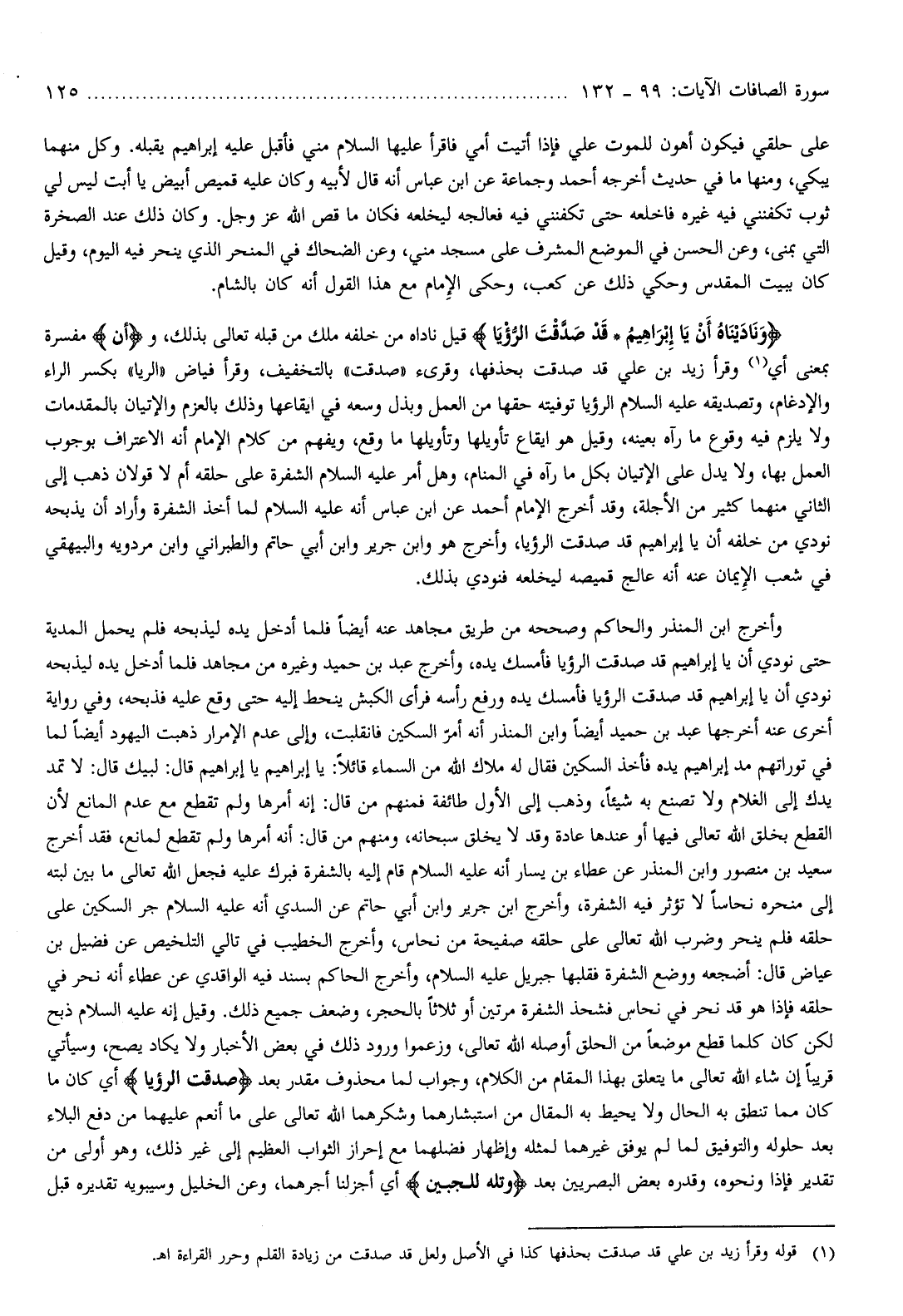 وَنادَيْناهُ أَنْ يا إِبْراهِيمُ قَدْ صَدَّقْتَ الرُّؤْيا قيل ناداه من خلفه ملك من قبله تعالى بذلك، وأَنْ مفسرة بمعنى أي (¬1) وقرأ زيد بن علي قد صدقت بحذفها، وقرىء «صدقت» بالتخفيف، وقرأ فياض «الريا» بكسر الراء والإدغام، وتصديقه عليه السلام الرؤيا توفيته حقها من العمل وبذل وسعه في إيقاعها وذلك بالعزم والإتيان بالمقدمات ولا يلزم فيه وقوع ما رآه بعينه، وقيل هو إيقاع تأويلها وتأويلها ما وقع، ويفهم من كلام الإمام أنه الاعتراف بوجوب العمل بها، ولا يدل على الإتيان بكل ما رآه في المنام، وهل أمر عليه السلام الشفرة على حلقه أم لا قولان ذهب إلى الثاني منهما كثير من الأجلة، وقد أخرج الإمام أحمد عن ابن عباس أنه عليه السلام لما أخذ الشفرة وأراد أن يذبحه نودي من خلفه أن يا إبراهيم قد صدقت الرؤيا، وأخرج هو وابن جرير وابن أبي حاتم والطبراني وابن مردويه والبيهقي في شعب الإيمان عنه أنه عالج قميصه ليخلعه فنودي بذلك.