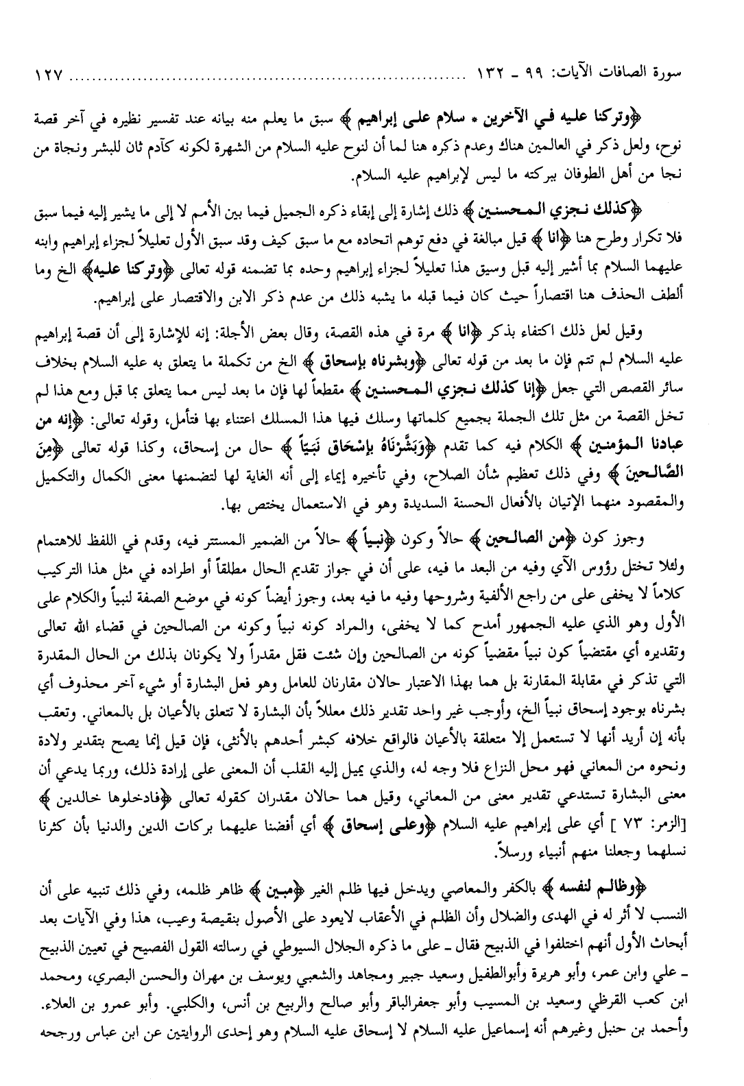وقيل لعل ذلك اكتفاء بذكر إِنَّا مرة في هذه القصة، وقال بعض الأجلة: إنه للإشارة إلى أن قصة إبراهيم عليه السلام لم تتم فإن ما بعد من قوله تعالى وَبَشَّرْناهُ بِإِسْحاقَ إلخ من تكملة ما يتعلق به عليه السلام بخلاف سائر القصص التي جعل إِنَّا كَذلِكَ نَجْزِي الْمُحْسِنِينَ مقطعا لها فإن ما بعد ليس مما يتعلق بما قبل ومع هذا لم تخل القصة من مثل تلك الجملة بجميع كلماتها وسلك فيها هذا المسلك اعتناء بها فتأمل، وقوله تعالى: إِنَّهُ مِنْ عِبادِنَا الْمُؤْمِنِينَ الكلام فيه كما تقدم وَبَشَّرْناهُ بِإِسْحاقَ نَبِيًّا حال من إسحاق، وكذا قوله تعالى مِنَ الصَّالِحِينَ وفي ذلك تعظيم شأن الصلاح، وفي تأخيره إيماء إلى أنه الغاية لها لتضمنها معنى الكمال والتكميل والمقصود منهما الإتيان بالأفعال الحسنة السديدة وهو في الاستعمال يختص بها.