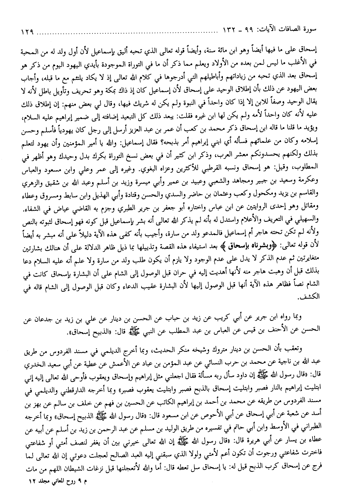 إسحاق على ما فيها أيضا وهو ابن مائة سنة، وأيضا قوله تعالى الذي تحبه أليق بإسماعيل لأن أول ولد له من المحبة في الأغلب ما ليس لمن بعده من الأولاد ويعلم مما ذكر أن ما في التوراة الموجودة بأيدي اليهود اليوم من ذكر هو إسحاق بعد الذي تحبه من زياداتهم وأباطيلهم التي أدرجوها في كلام الله تعالى إذ لا يكاد يلتئم مع ما قبله، وأجاب بعض اليهود عن ذلك بأن إطلاق الوحيد على إسحاق لأن إسماعيل كان إذ ذاك بمكة وهو تحريف وتأويل باطل لأنه لا يقال الوحيد وصفا للابن إلا إذا كان واحدا في النبوة ولم يكن له شريك فيها، وقال لي بعض منهم: إن إطلاق ذلك عليه لأنه كان واحدا لأمه ولم يكن لها ابن غيره فقلت: يبعد ذلك كل التبعيد إضافته إلى ضمير إبراهيم عليه السلام، ويؤيد ما قلنا ما قاله ابن إسحاق ذكر محمد بن كعب أن عمر بن عبد العزيز أرسل إلى رجل كان يهوديا فأسلم وحسن إسلامه وكان من علمائهم فسأله أي ابني إبراهيم أمر بذبحه؟ فقال إسماعيل: والله يا أمير المؤمنين وأن يهود لتعلم بذلك ولكنهم يحسدونكم معشر العرب، وذكر ابن كثير أن في بعض نسخ التوراة بكرك بدل وحيدك وهو أظهر في المطلوب، وقيل: هو إسحاق ونسبه القرطبي للأكثرين وعزاه البغوي. وغيره إلى عمر وعلي وابن مسعود والعباس وعكرمة وسعيد بن جبير ومجاهد والشعبي وعبيد بن عمير وأبي ميسرة وزيد بن أسلم وعبد الله بن شقيق والزهري والقاسم بن يزيد ومكحول وكعب وعثمان بن حاضر والسدي والحسن وقتادة وأبي الهذيل وابن سابط ومسروق وعطاء ومقاتل وهو إحدى الروايتين عن ابن عباس واختاره أبو جعفر بن جرير الطبري وجزم به القاضي عياض في الشفاء.